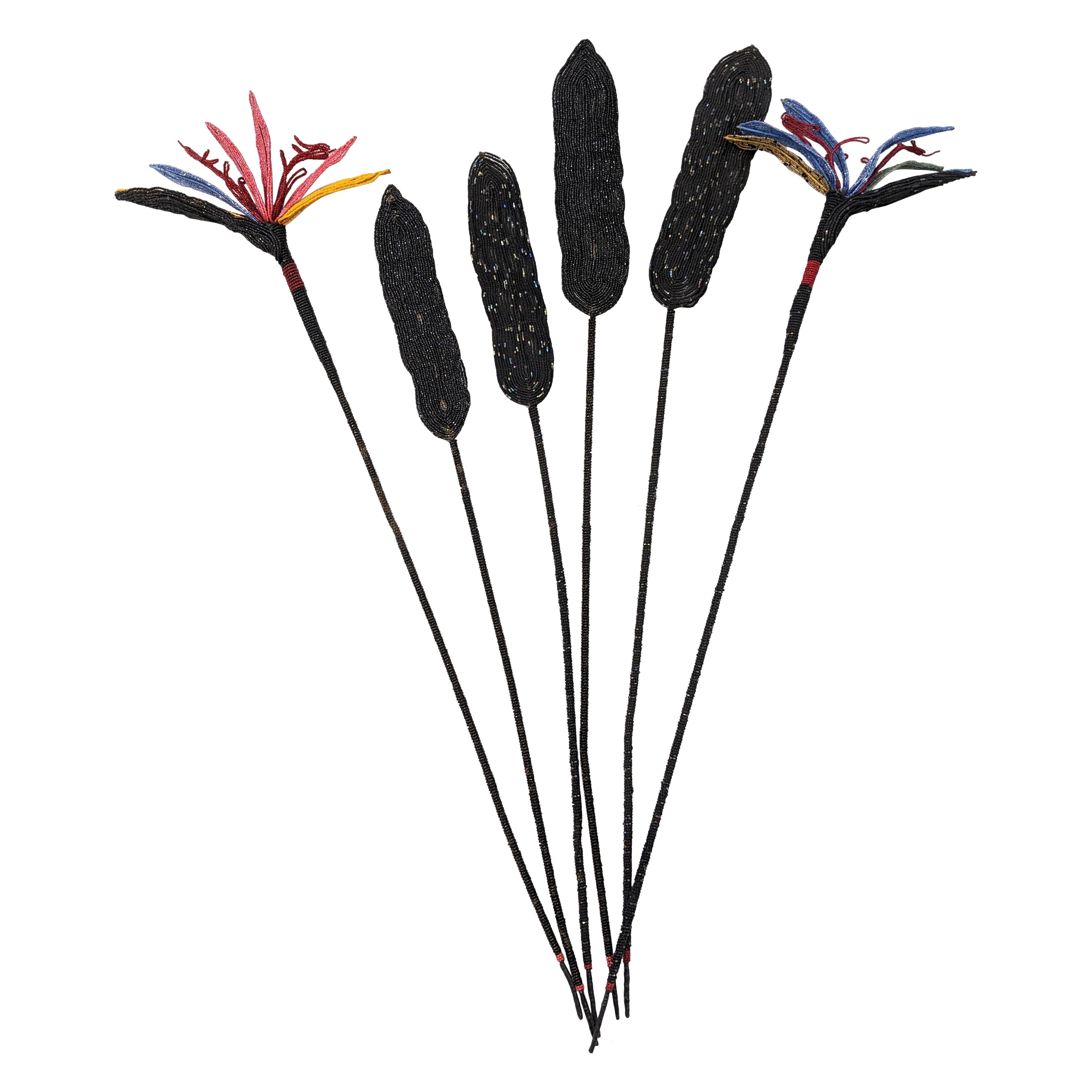 Set di steli di uccello del paradiso con perline realizzate a mano alla fine degli anni '90 in Francia. Realizzato su misura negli anni '90 con perline ceche antiche e nuove. Set di 2 pezzi ciascuno: Teste di fiori/ Foglie nere opache e verdi iridescenti/ Foglie nere. Anche gli steli sono completamente perlinati.