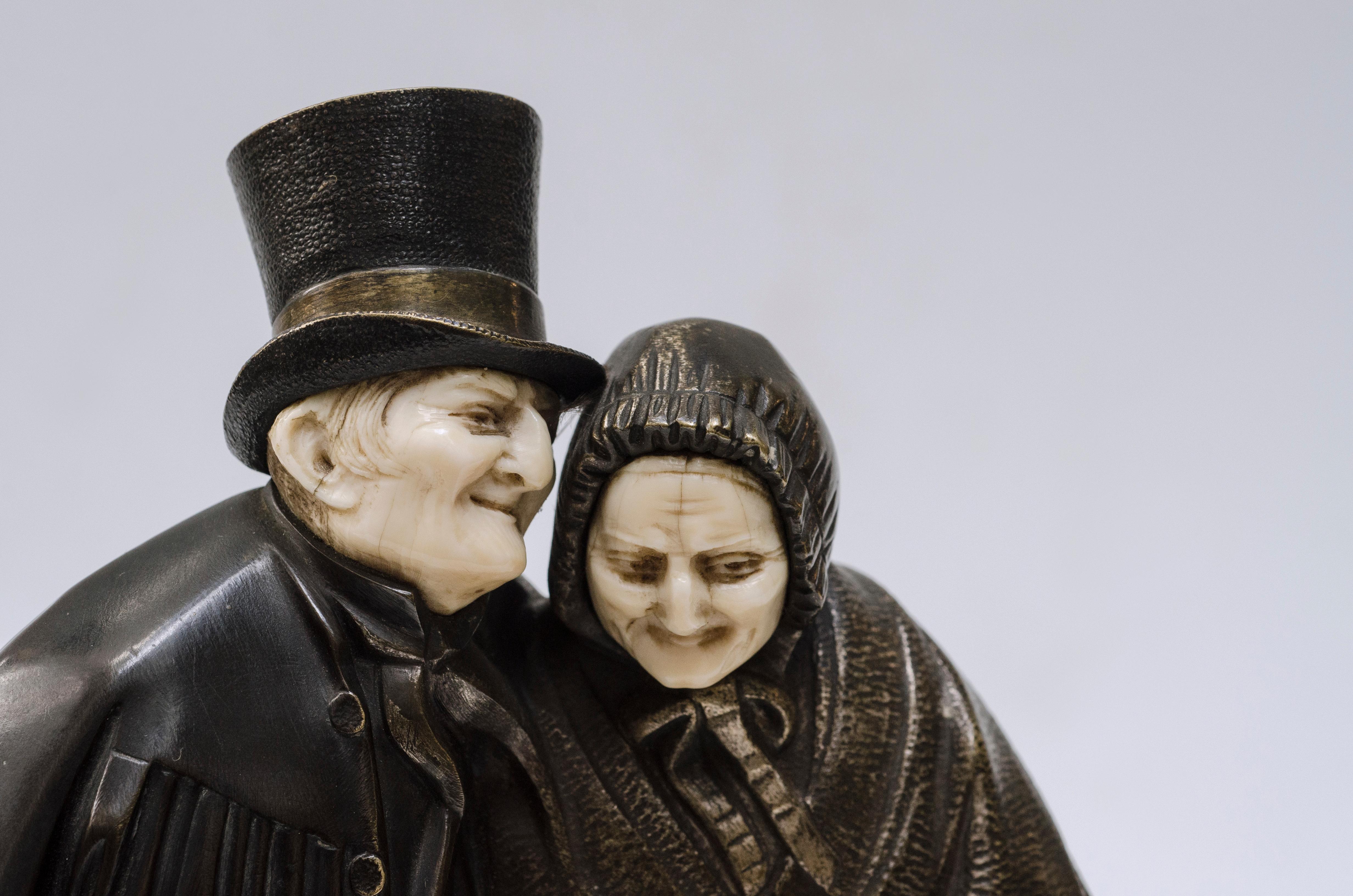 Scultura in ceramica dipinta a mano del XIX secolo francese raffigurante una coppia di anziani