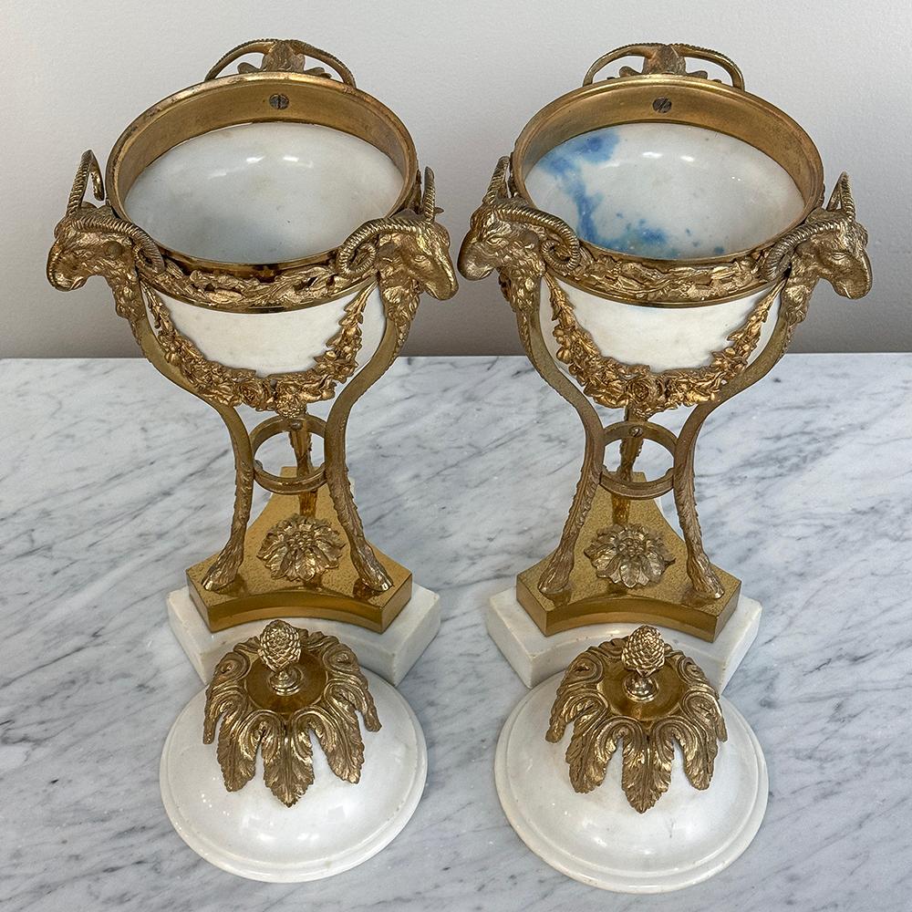 Coppia di antiche urne francesi Luigi XVI rivestite in marmo e bronzo dorato, ciascuna impreziosito da ghirlande foliate e da un finale a bacche, applicato con maschere di arieti so...