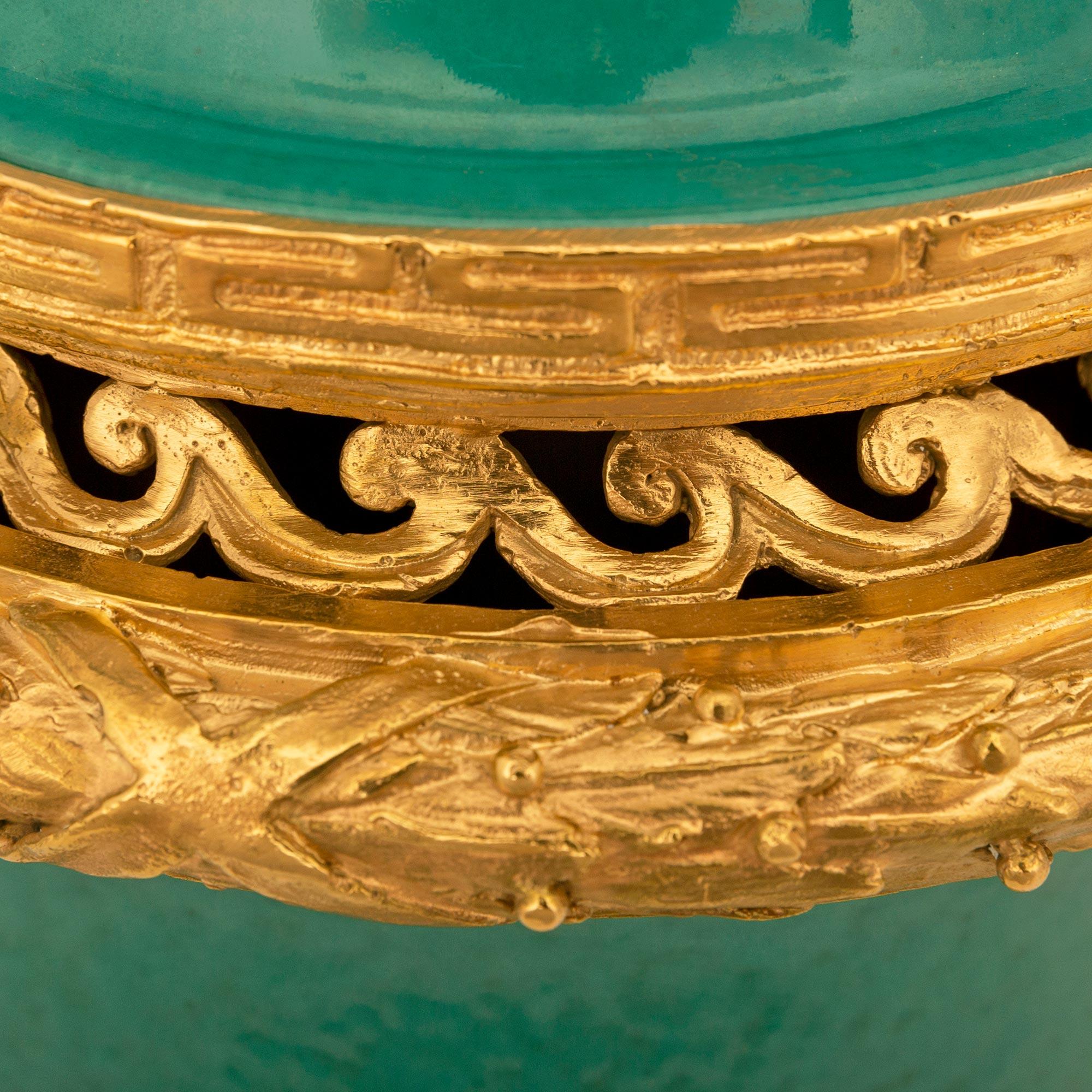 Una bella coppia di urne con coperchio in porcellana e ormolu del XIX secolo in stile Luigi XVI. Ogni urna è sollevata da una base quadrata in ormolu con eleganti disegni a chiave greca su ciascun lato, sotto il supporto del piedistallo a forma di socle leggermente incurvata con suggestive foglie d'acanto riccamente cesellate e deliziose fasce scanalate circolari e legate. Il bellissimo corpo in porcellana color turchese, probabilmente di Sèvres, presenta un bordo molto decorato con ulteriori disegni di chiavi greche avvolgenti, volute vitruviane traforate e bande di alloro con bacche riccamente cesellate in una superba finitura satinata e brunita. Il coperchio mostra un'eccezionale ghianda finemente dettagliata in mezzo a disegni fogliacei e si solleva per rivelare l'interno rifinito.