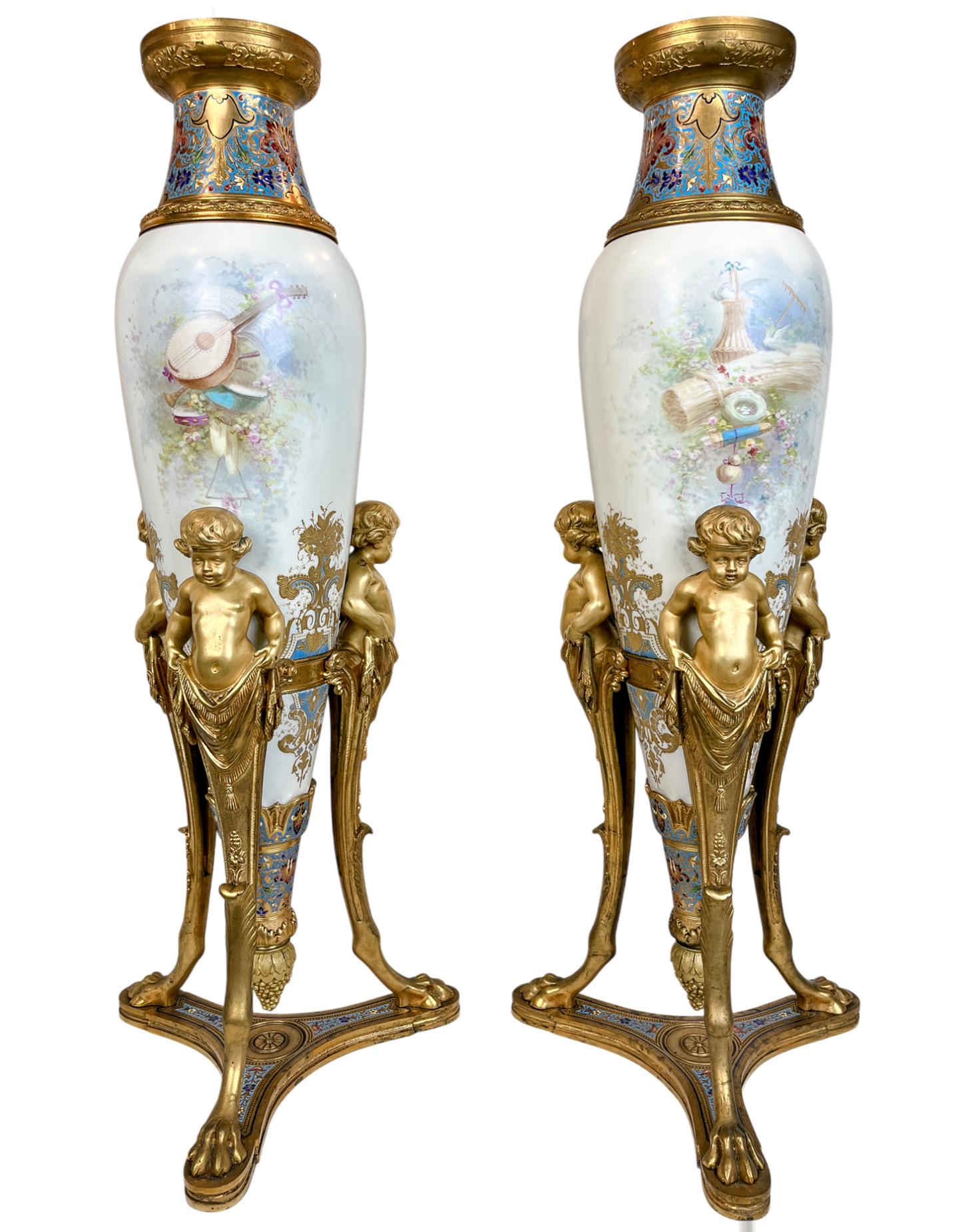 Coppia di vasi in bronzo dorato e smalto champleve su tre supporti figurati a cherubino con piedi a zampa. Anfore dipinte a mano con scene di putti sul fronte e nature morte con flora e strumenti musicali sul retro.