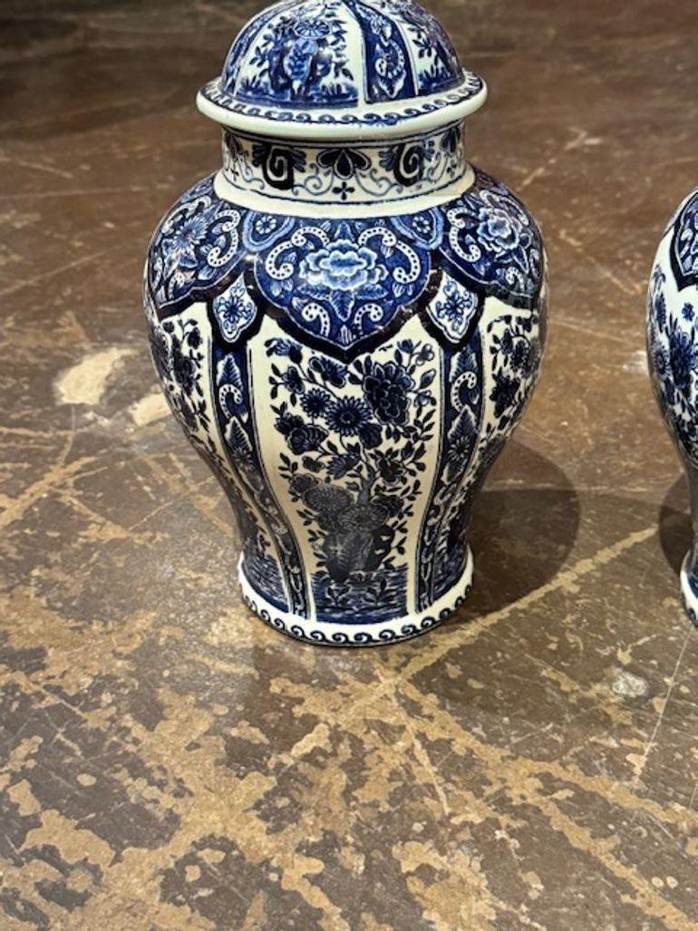 Coppia di vasi olandesi in porcellana blu e bianca in stile Delft. Circa 1940. Uno dei preferiti dai migliori designer!