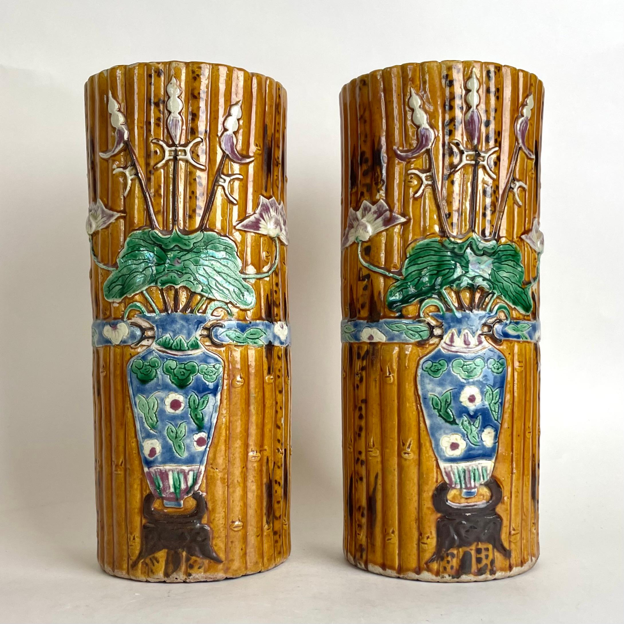 Coppia di vasi di bambù in maiolica inglese del XIX secolo