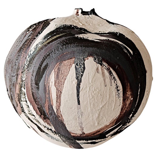 Questo vaso in ceramica unico nel suo genere presenta una silhouette morbidamente arrotondata e organica abbinata a una superficie ricca di tatto, rifinita con uno smalto craterizzat...