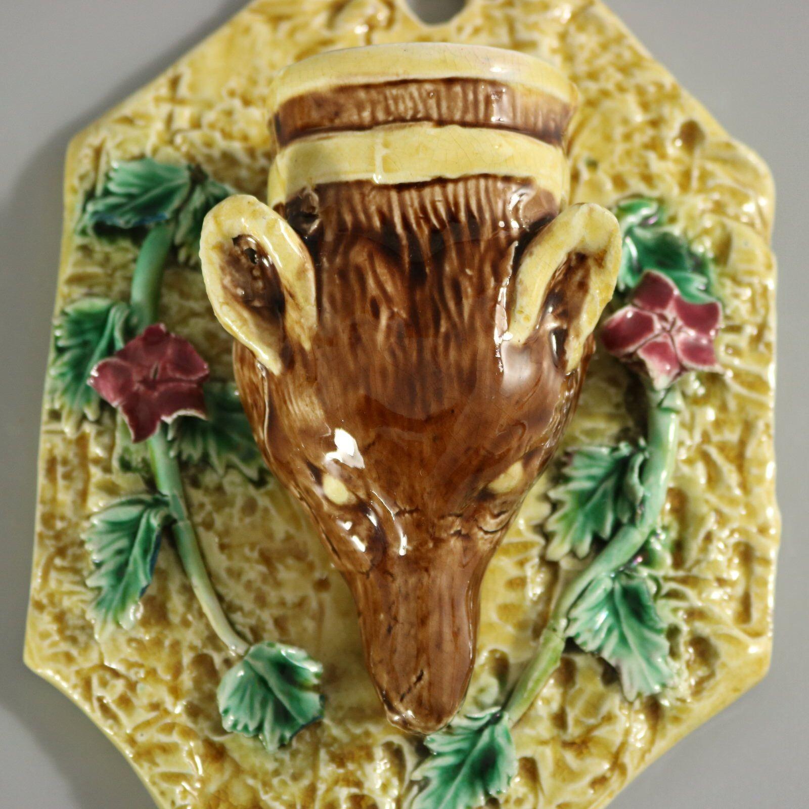 Tasca da parete in maiolica che presenta il modello di una staffa a testa di volpe, seduta su un fondo sagomato, con fiori ai lati. Colorazione: predominano il giallo, il marrone e il verde.
