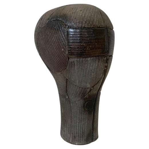 Forma cilindrica in gres smaltato marrone con tratti in uno smalto più scuro.