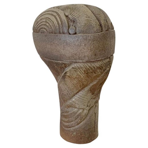 Forma cilindrica in gres smaltato marrone con tratti in uno smalto più scuro.