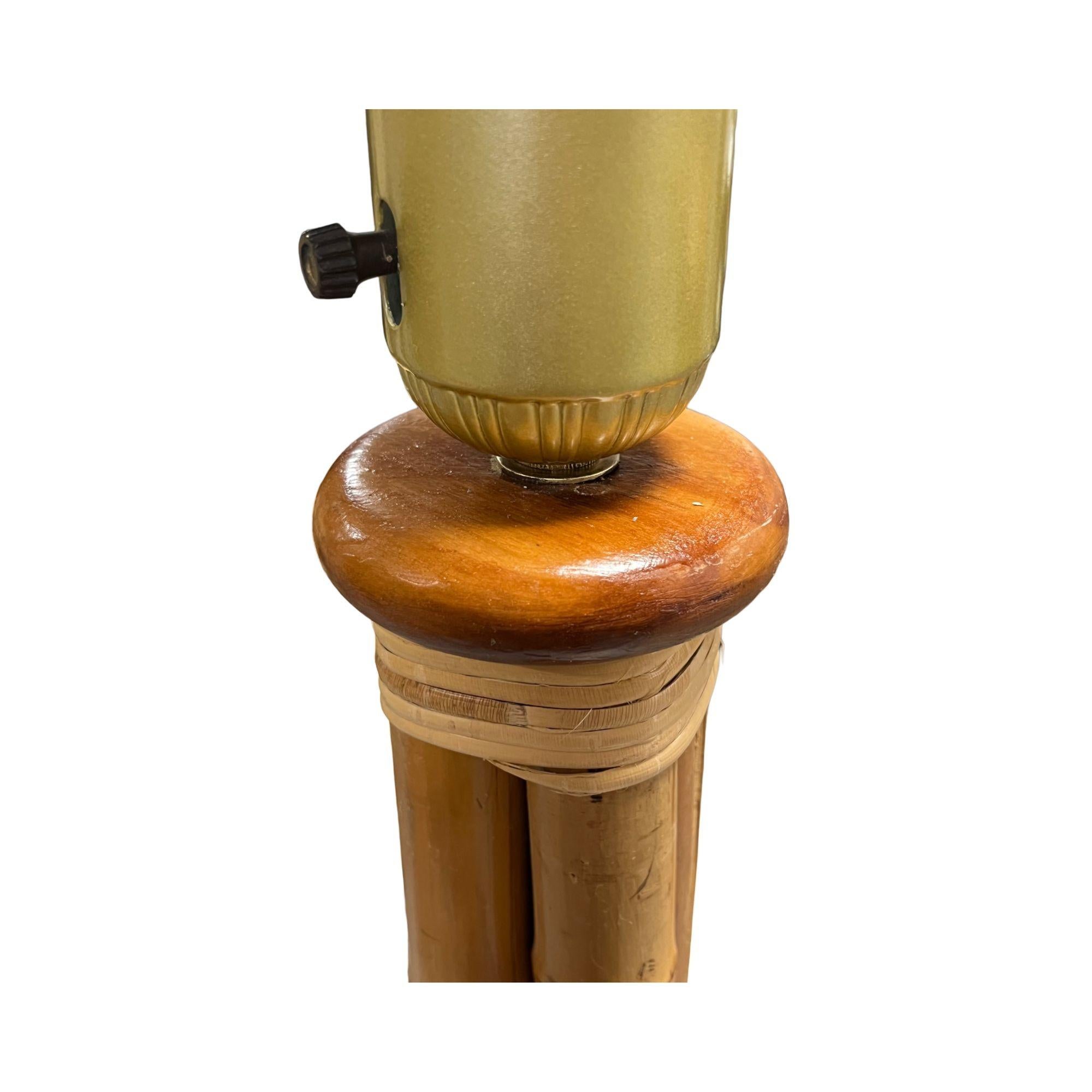 Questa lampada in rattan a palo di ispirazione Paul Frankl, splendidamente restaurata, è composta da quattro pali in rattan legati insieme da fasce di vimini e montati su una base in ottone. La lampada è sormontata da una grande presa di luce in ottone lungo la parte superiore, fatta per contenere un paralume da torchiere in vetro e fissata a un piano in mogano.