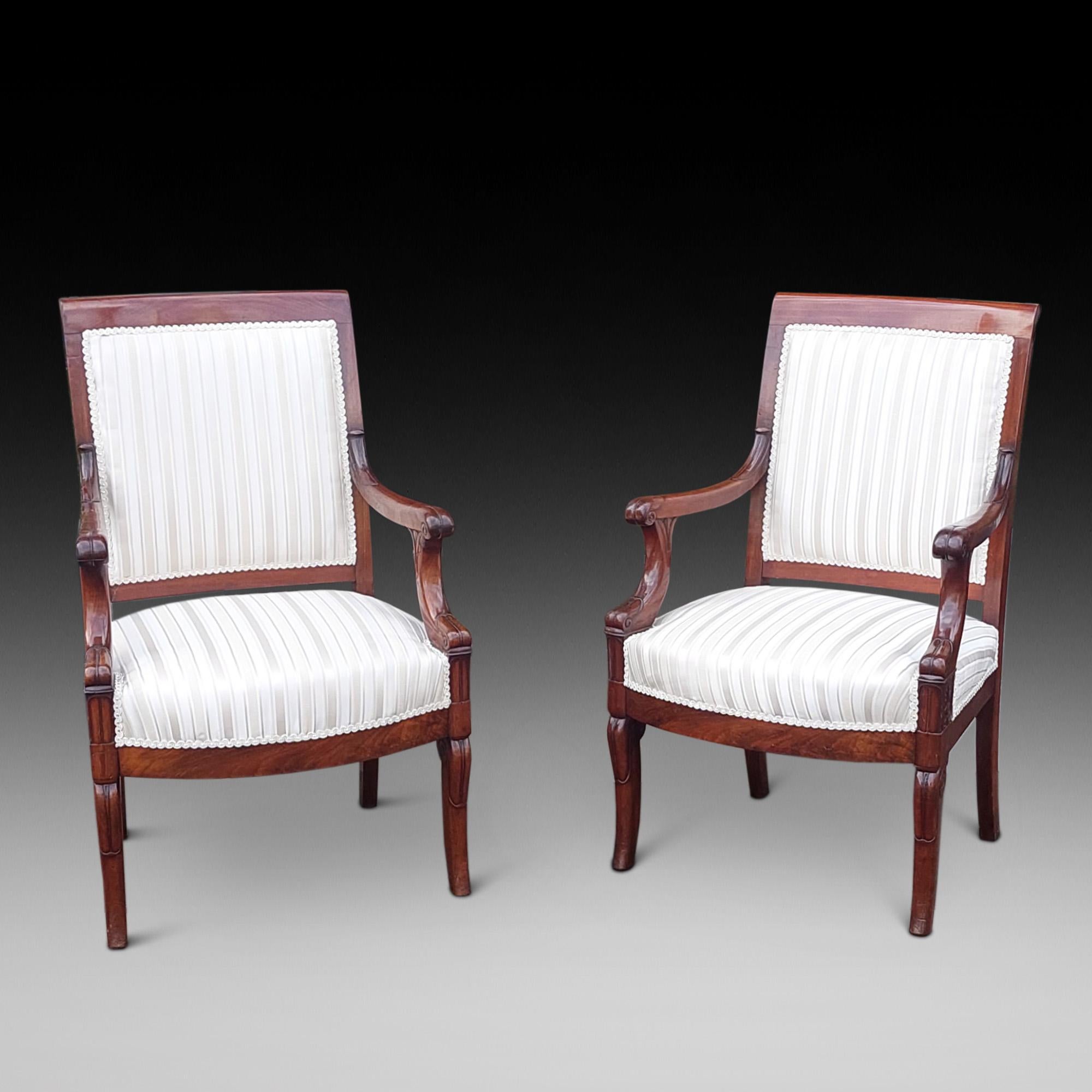 Una distinta coppia di antiche poltrone francesi in mogano Impero intagliato, risalenti alla fine del XVIII o all'...