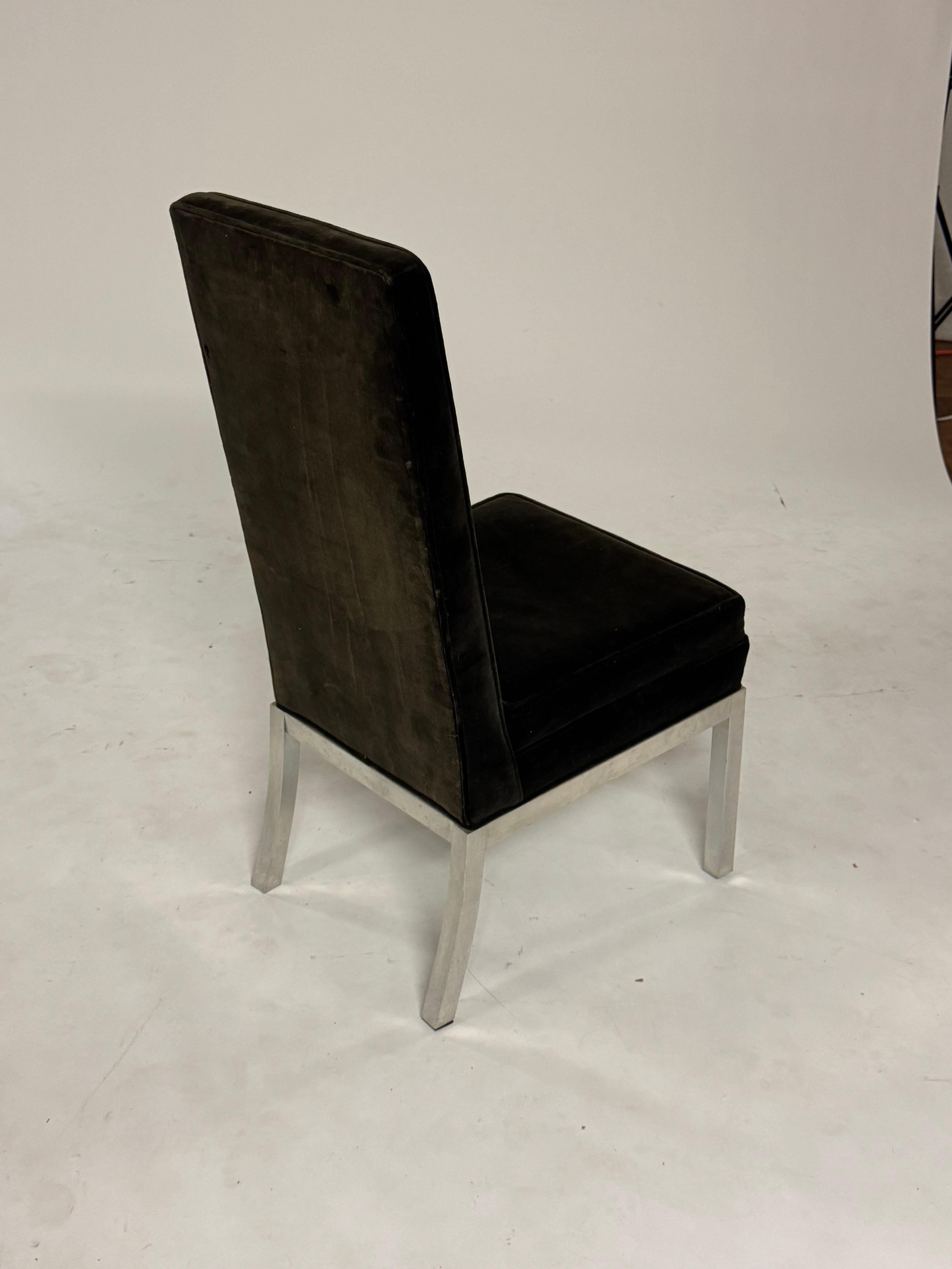Set di quattro sedie da pranzo con schienale alto rivestite in velluto marrone su telaio quadrato in alluminio, le gambe posteriori sono leggermente distanziate. Nello stile di Milo Baughman, o anche di Paul Mayen che ha lavorato nell'alluminio. Necessita di una nuova tappezzeria.