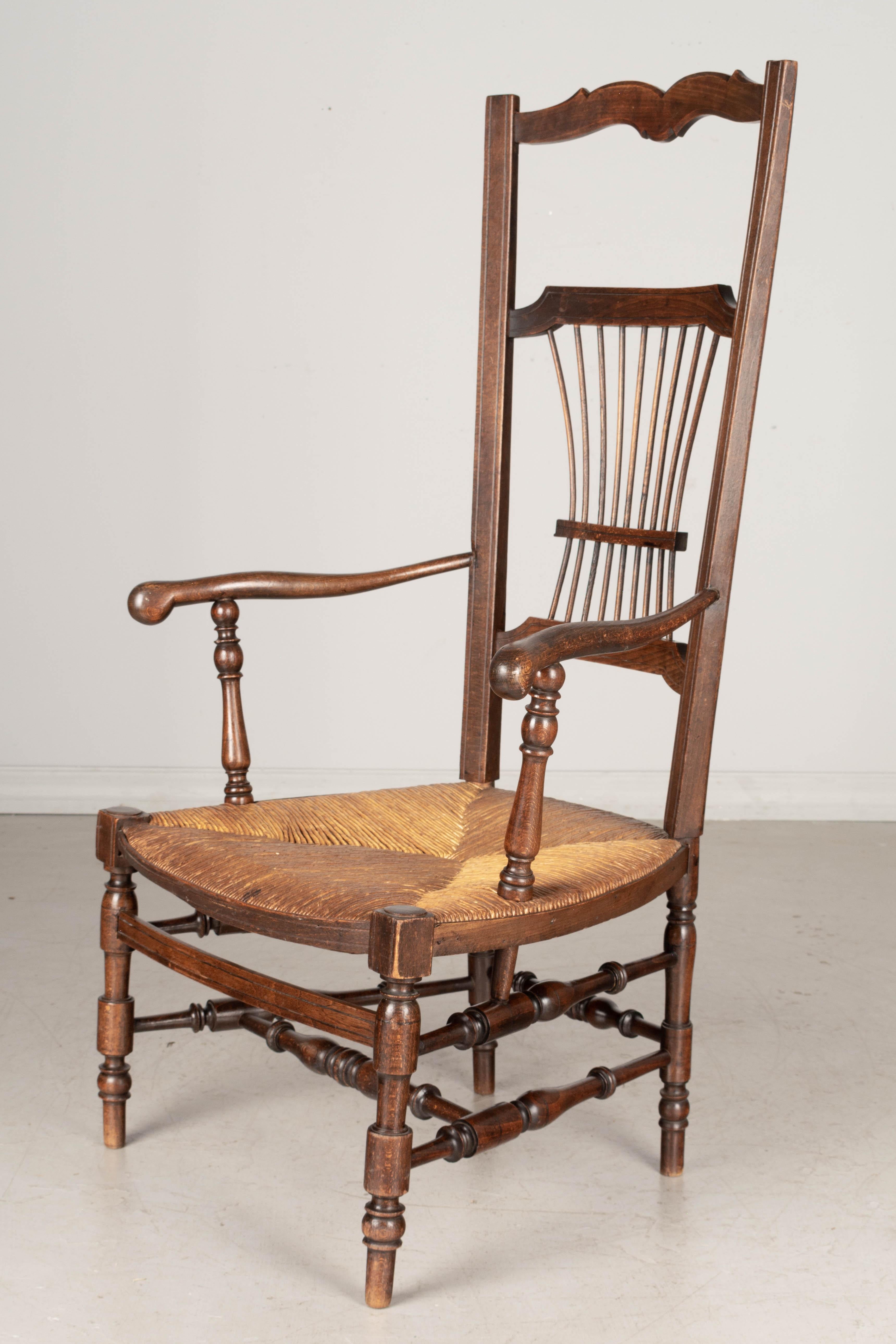 Una chauffeuse francese, o sedia da caminetto, con seduta bassa e schienale alto. Struttura in legno di faggio lavorata a mano con schienale in stile covone di grano e barelle a fuso tornite. Seduta in giunco naturale. Robusto e confortevole.