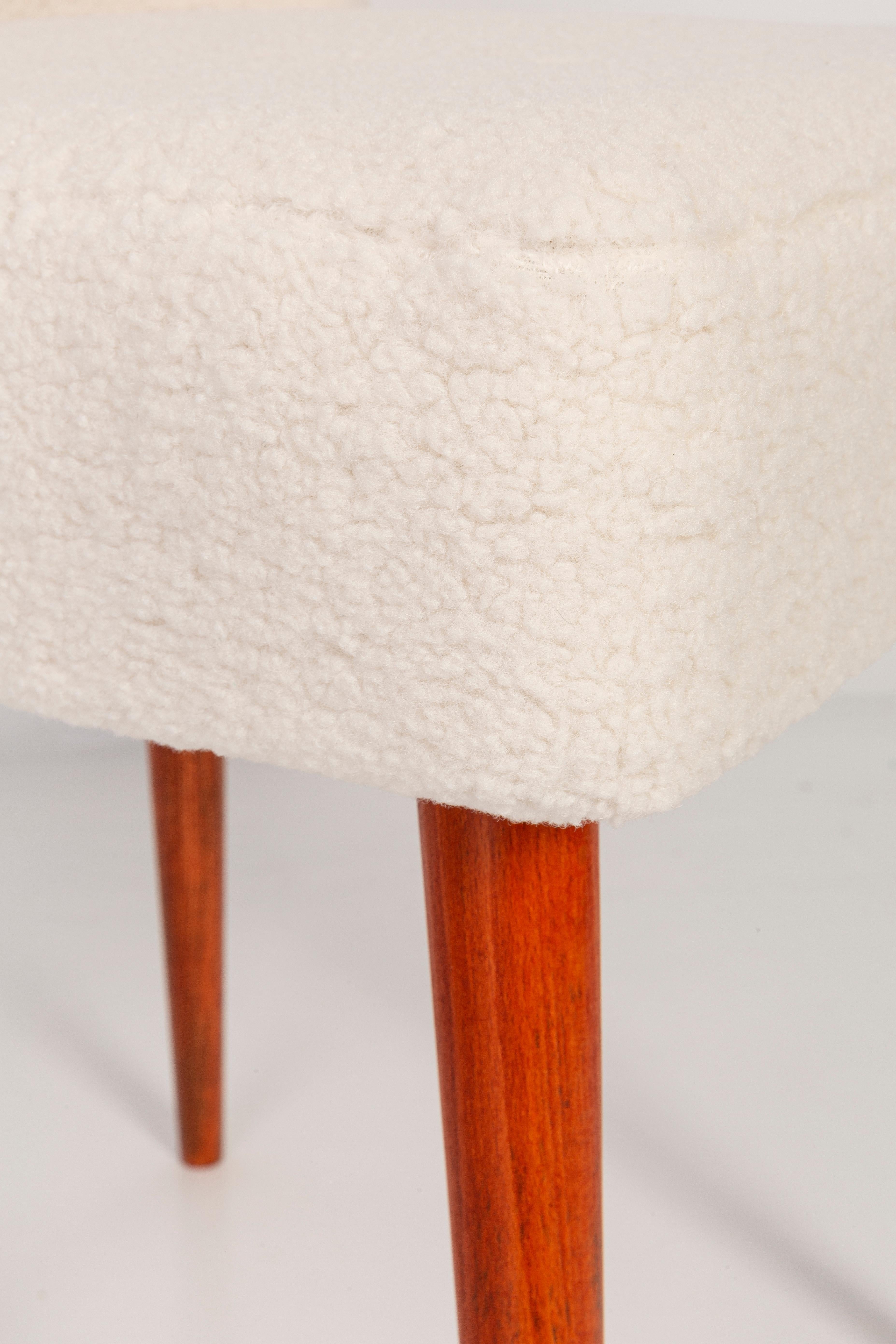 Bellissima sedia del tipo 1020, chiamata colloquialmente "conchiglia", prodotta dal centro dell'industria del mobile di Slupsk negli anni '60 in Polonia. Vogliono rinnovare completamente la tappezzeria e la falegnameria. La seduta e lo schienale sono in tessuto bouclé color crema, resistente e piacevole al tatto. Possiamo preparare questa sedia in ogni colore di legno e tessuto, anche in set più grandi. Consulta l'ultima immagine con i campioni di colore del bouclé e del Wood.