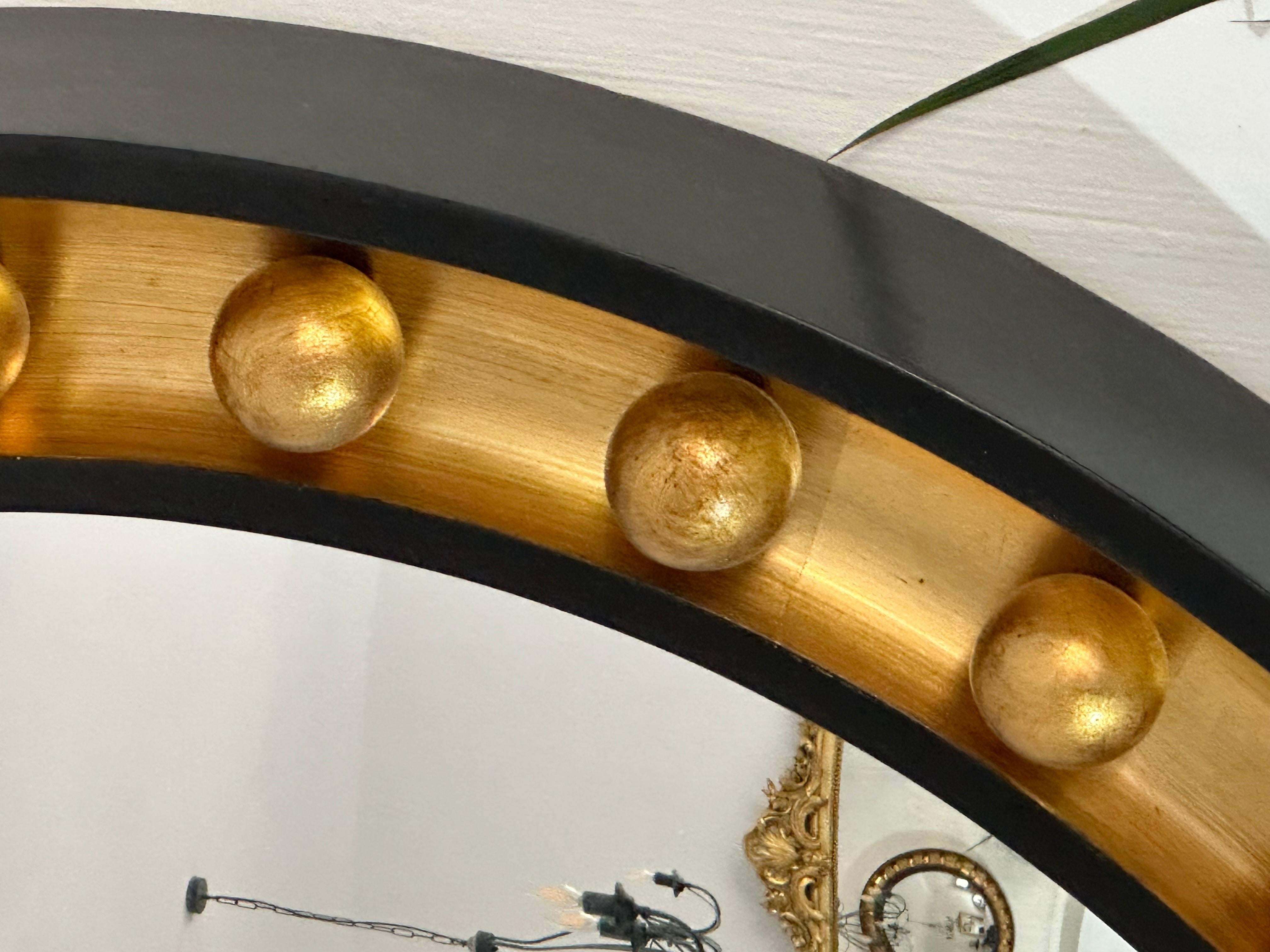 Questo specchio convesso in legno dorato ed ebanizzato intagliato ha una cornice interna modellata e una cornice esterna modellata e composta con sfere dorate decorative che punteggi...