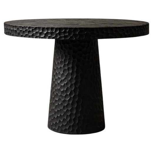 Realizzato a mano in solido rovere europeo, questo tavolo da pranzo rotondo del designer Sergio Vulpe incarna una semplicità scultorea con un'audace finitura nera. La profonda superficie opaca esalta la sua silhouette brutalista, lasciando emergere nell'oscurità sottili tracce delle venature naturali del rovere.