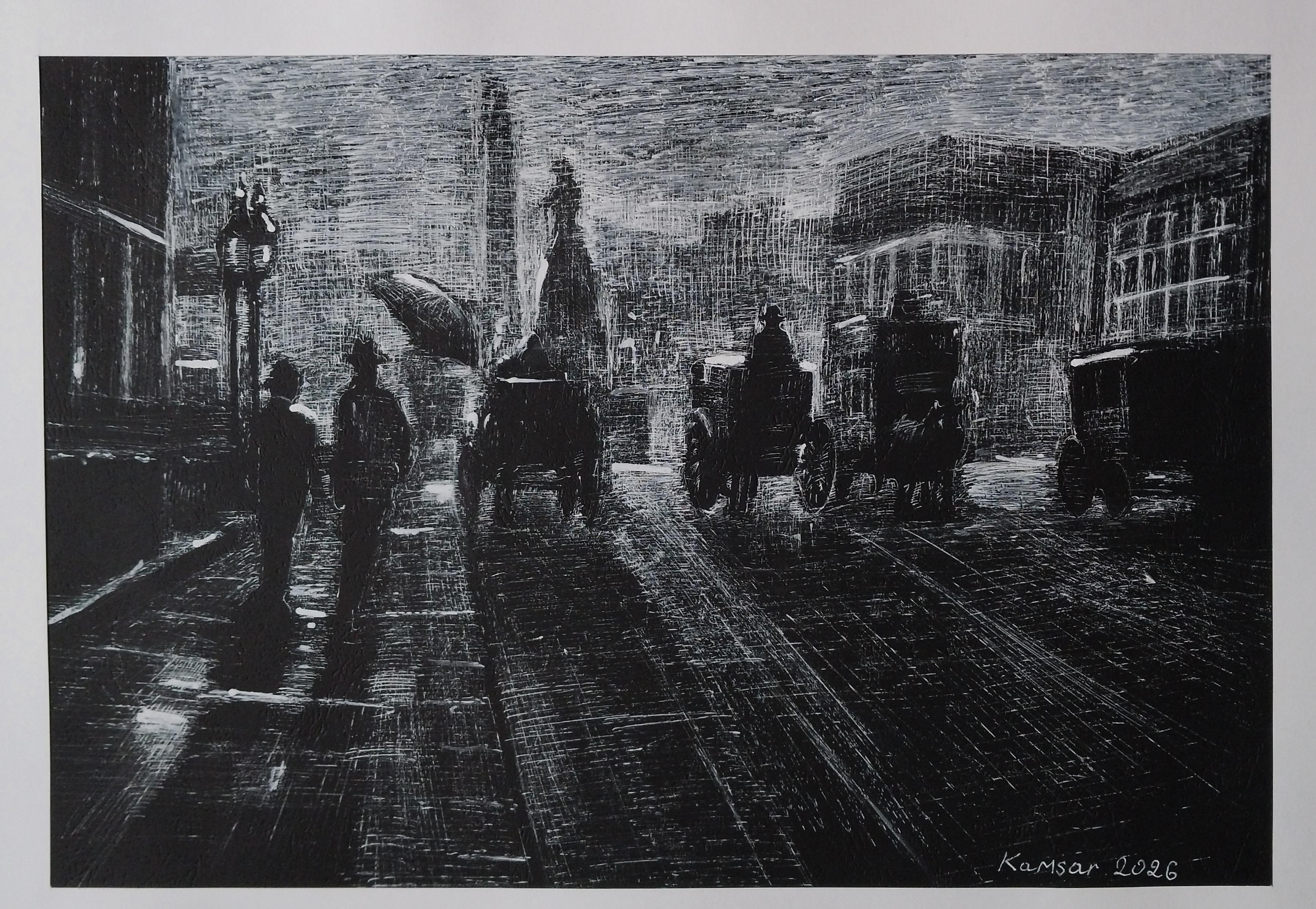 L'artista Onelio Marrero ritrae la vivace energia del traffico di Midtown Manhattan, guardando verso sud in un pomeriggio di pioggia. Le pennellate vivaci...