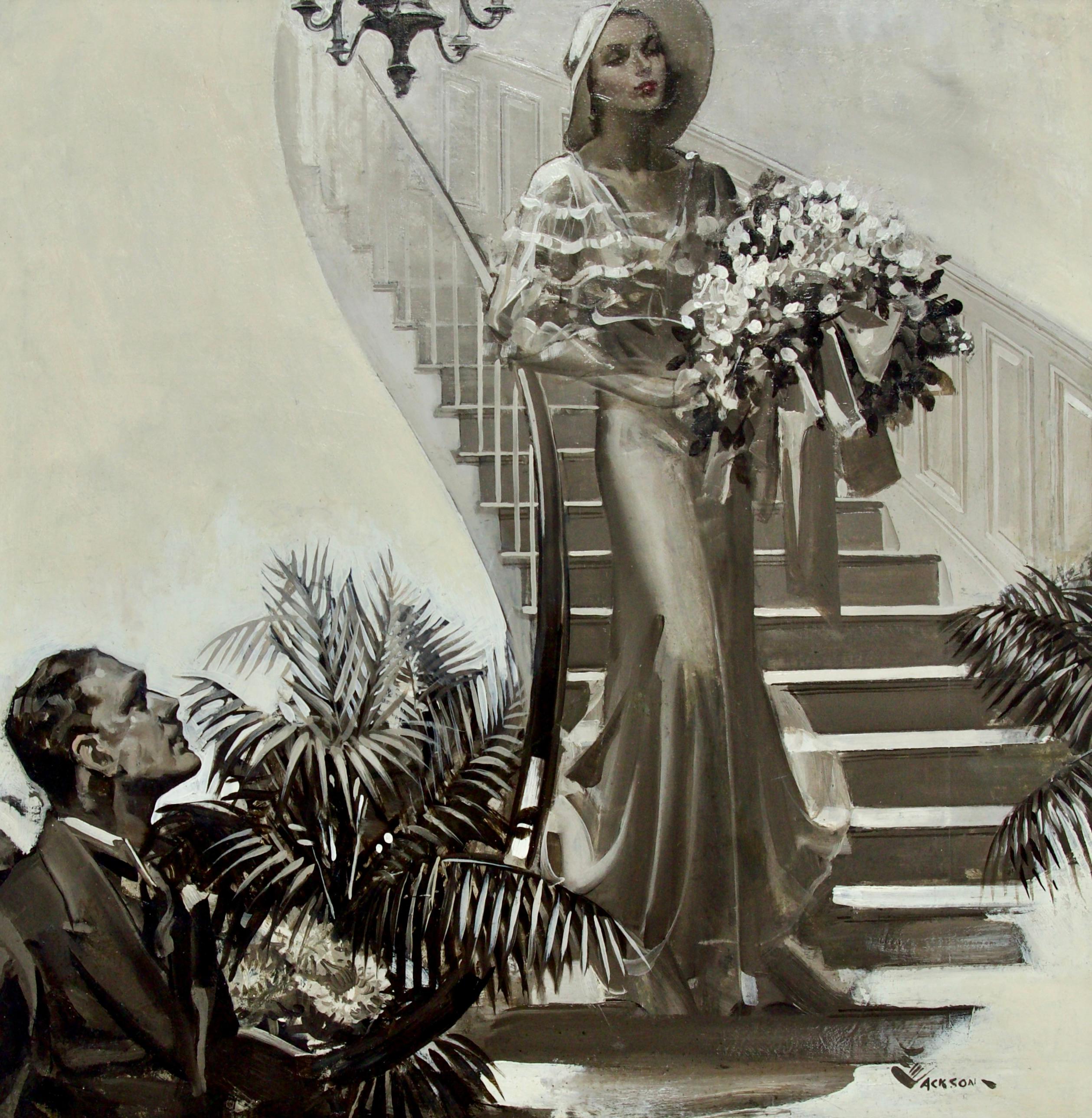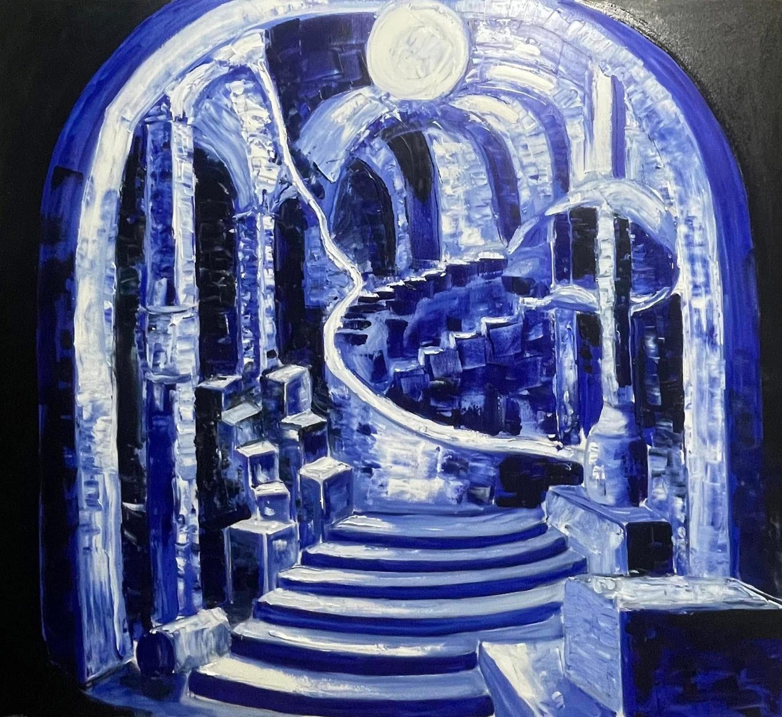 Un'impressionante scena architettonica / scenografia surrealista del Mid-Century Modern degli anni '50 realizzata dal noto scenografo, costumista e stilista francese Andre Delfau (19...