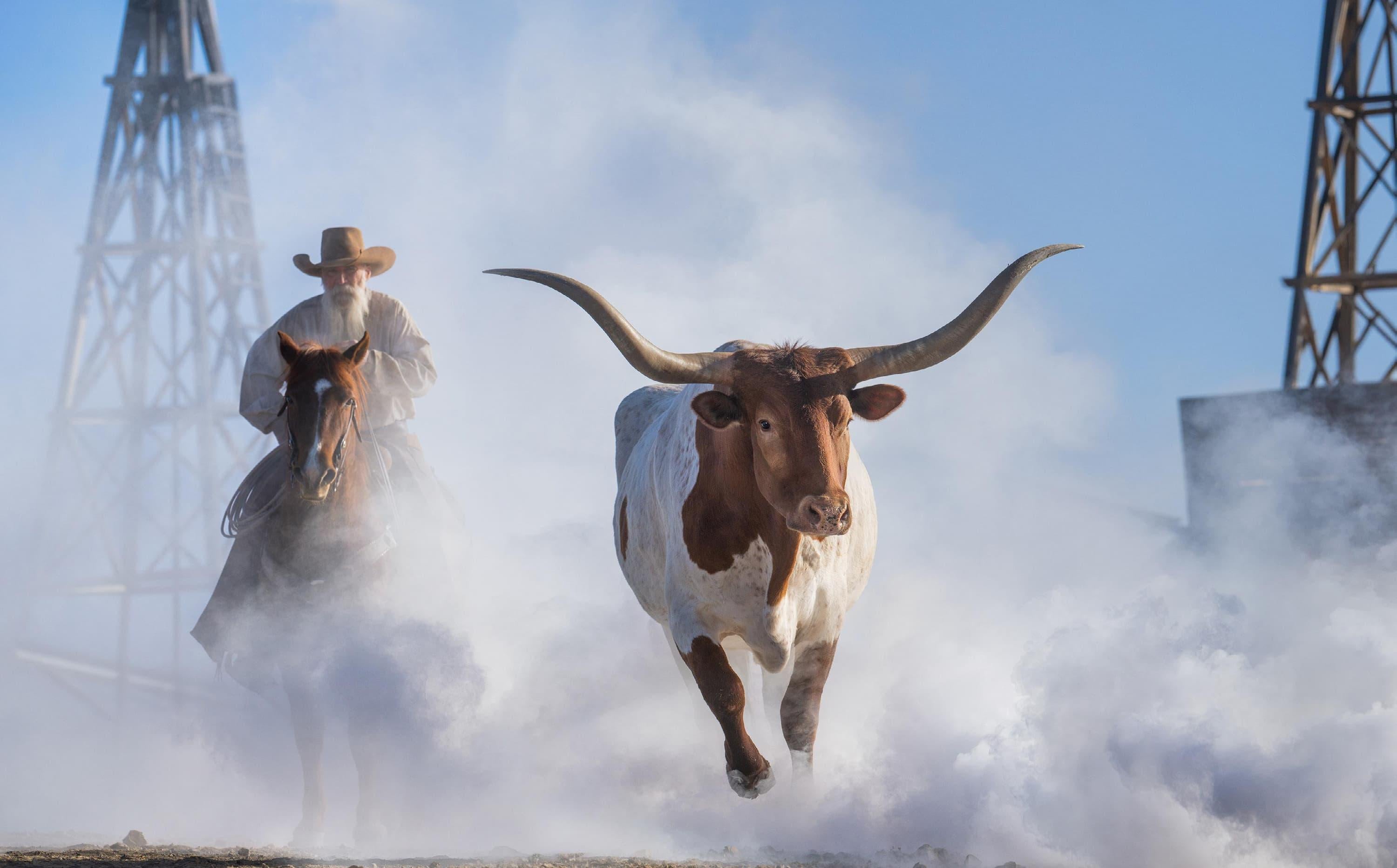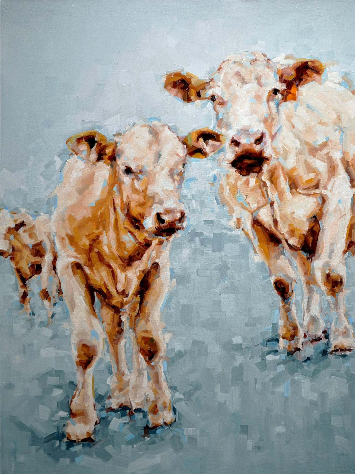 Enorme dipinto ad olio antico Mucche delle Highlands nel paesaggio scozzese del fiume che scorre