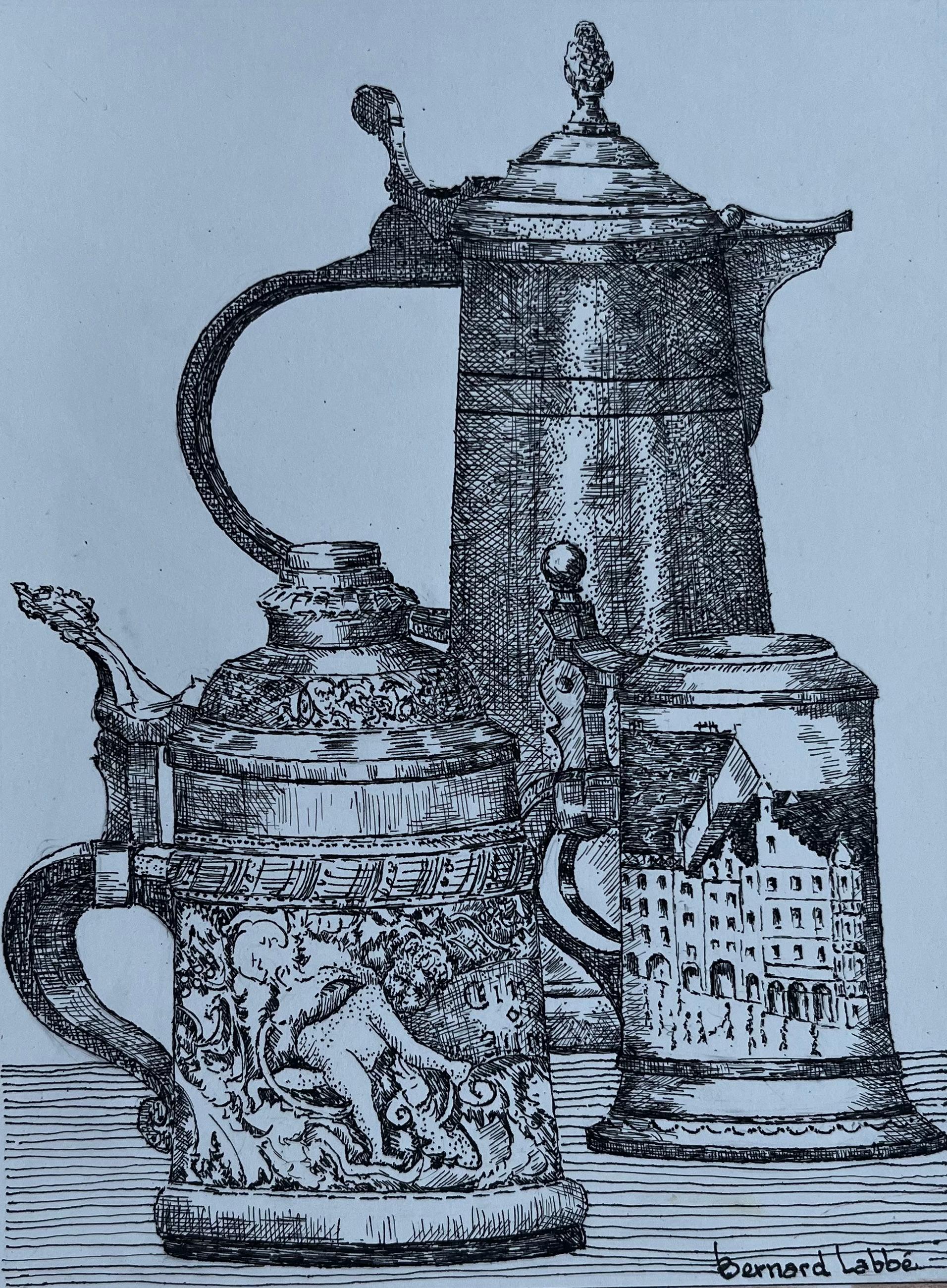 Pittura ad olio modernista francese della metà del 20° secolo: Natura morta con tè e piattini