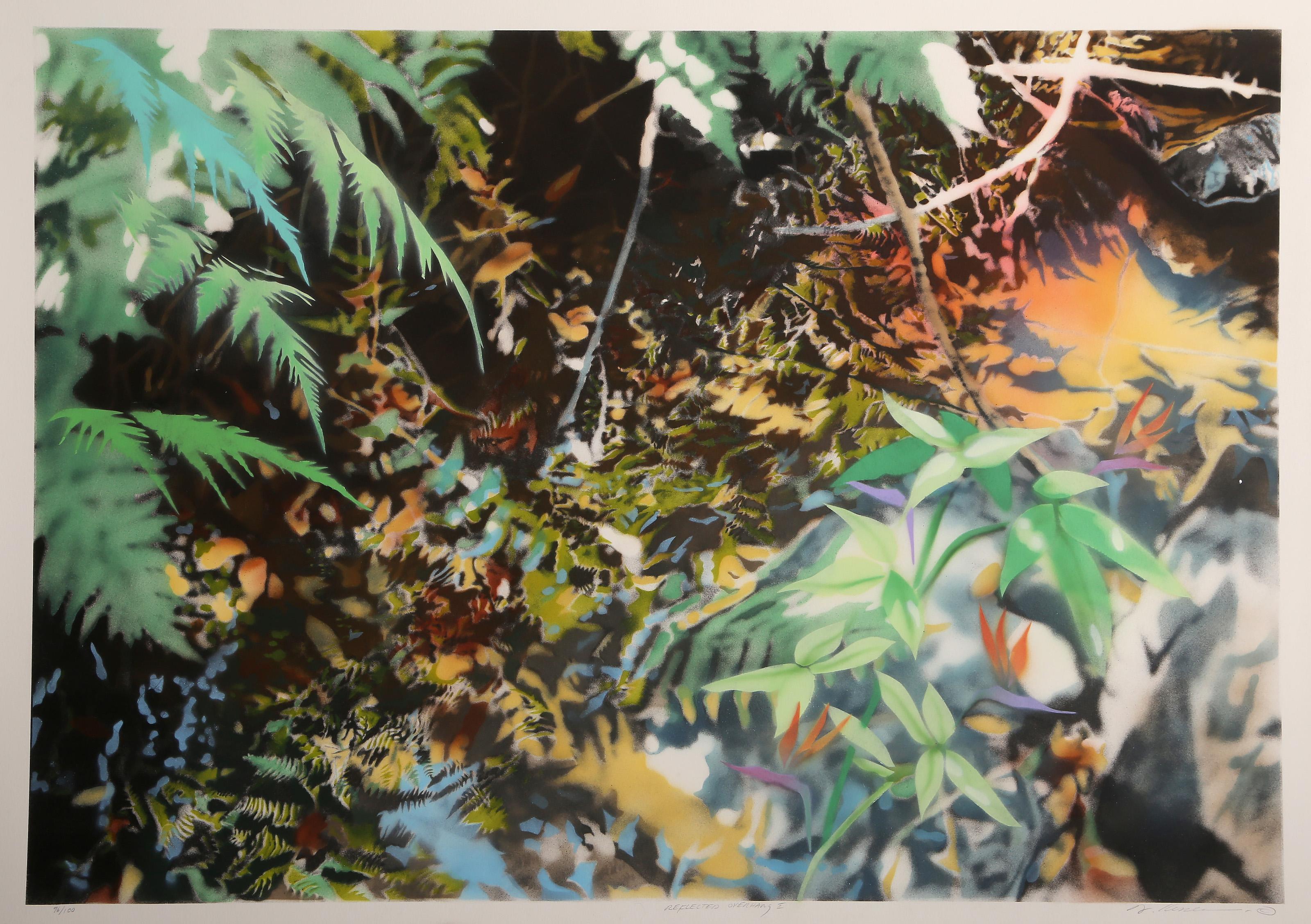 Gerald Berghammer - Fotografia di paesaggio minimalista a colori. Una rigogliosa vegetazione tropicale con palme e uno stretto corso d'acqua al centro. Stampa con inchiostro a pigme...
