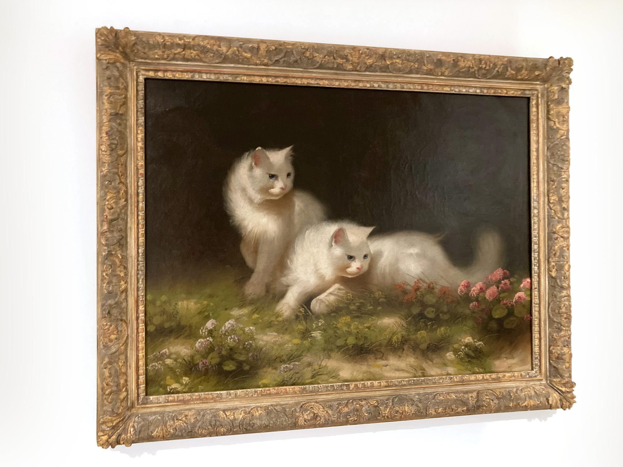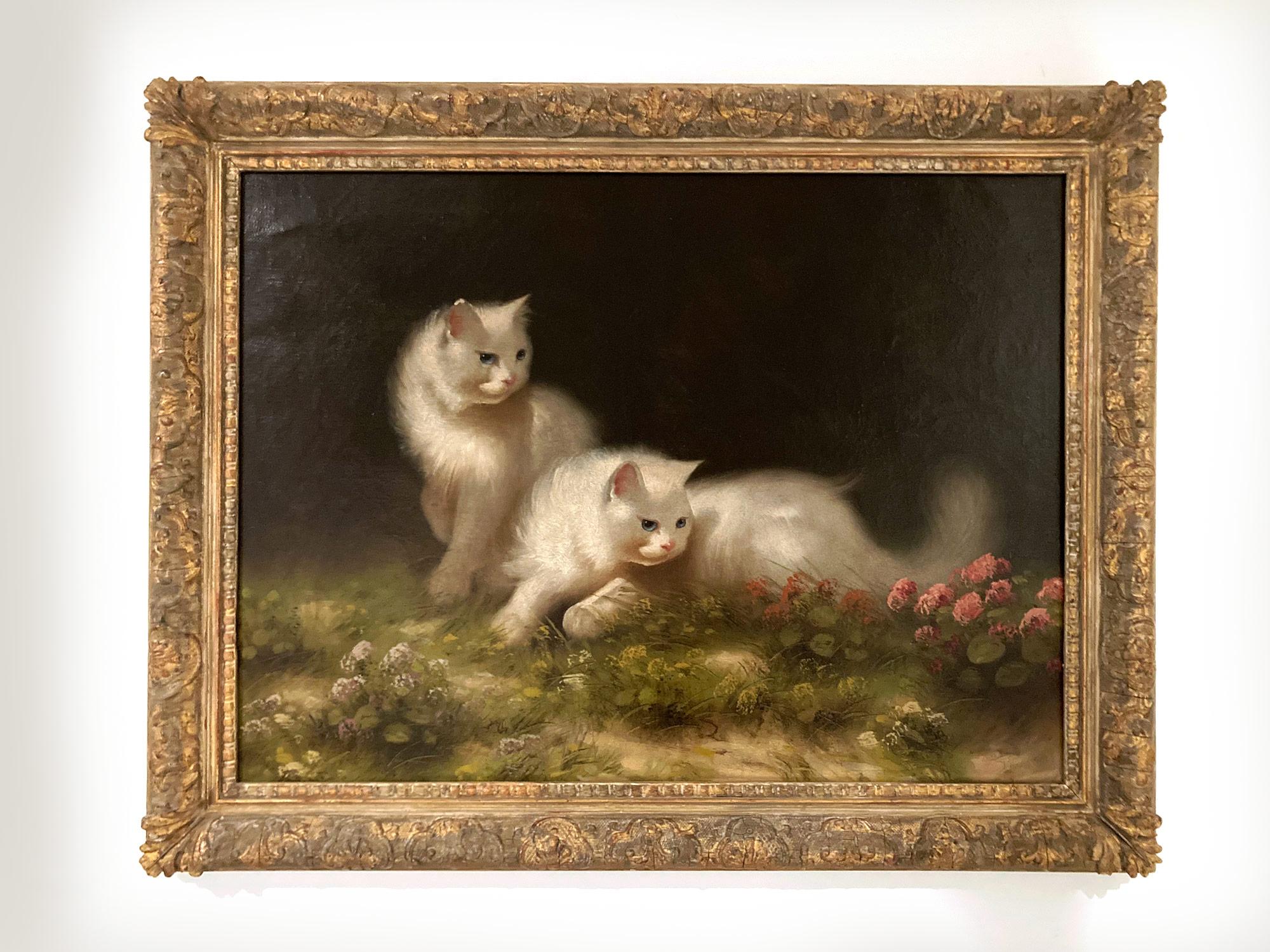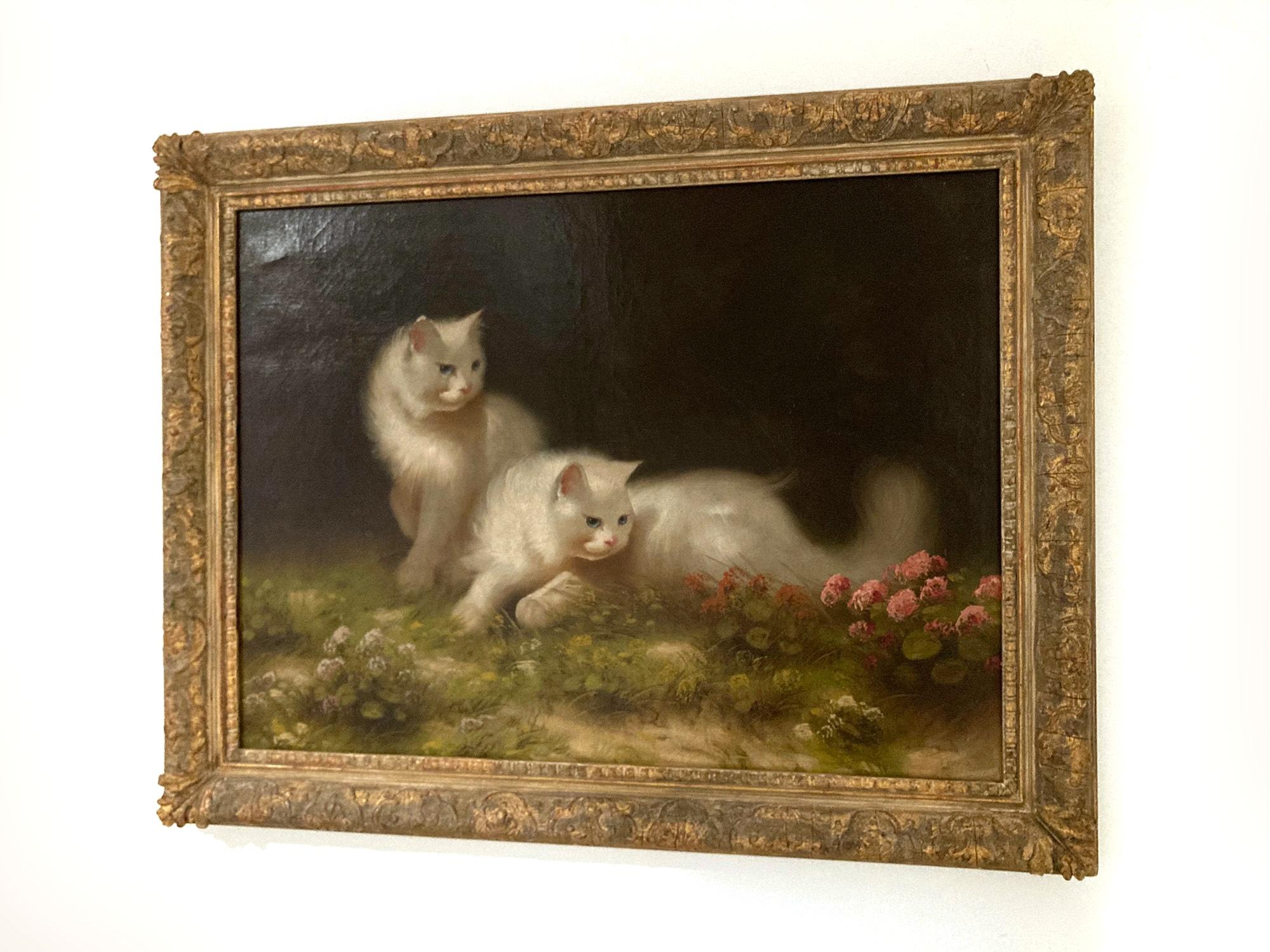 Beno Boleradsky"Gatti persiani con fiori" Ritratto ad olio di due gatti bianchi in un giardino20° secolo