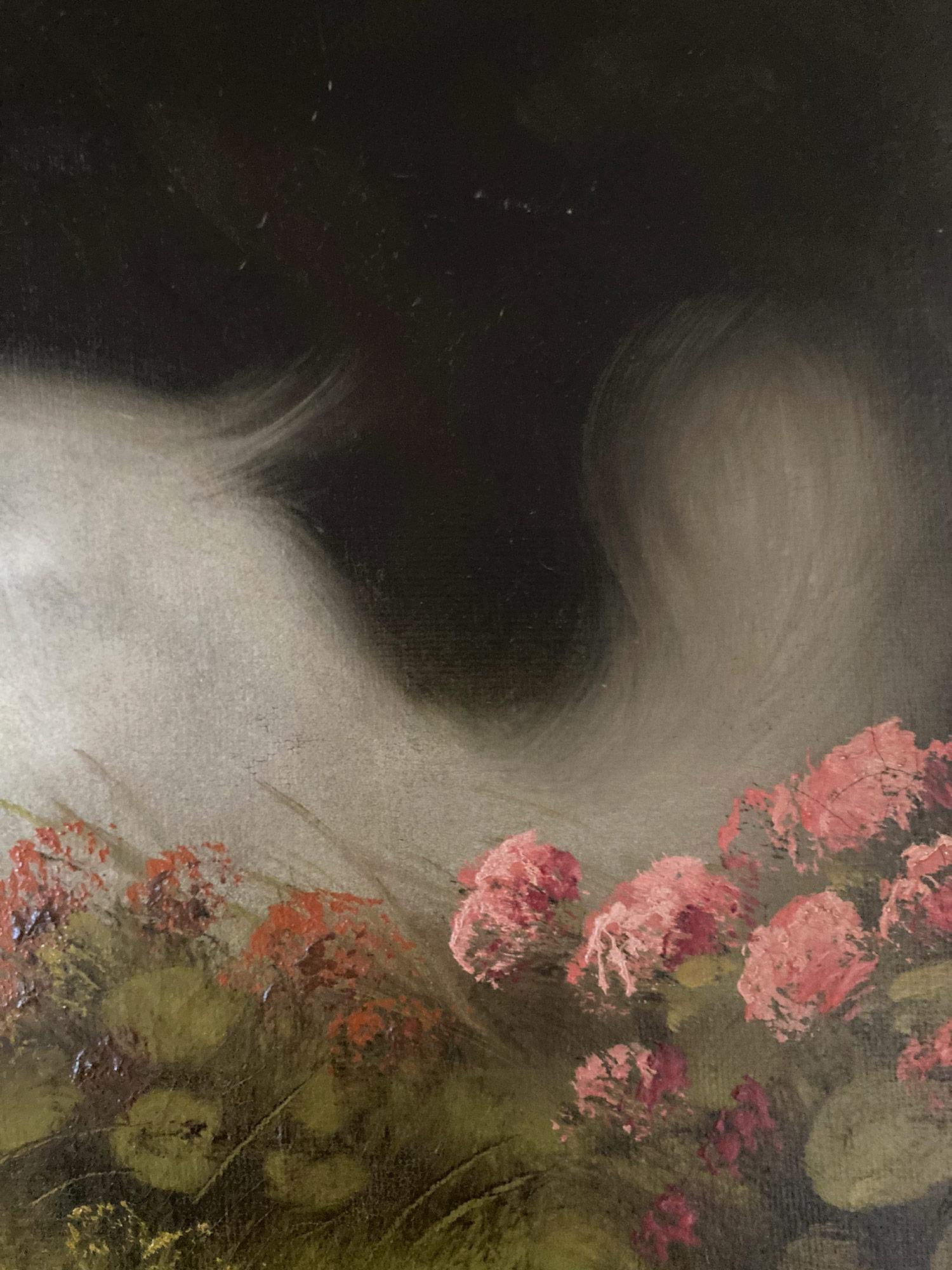 Questo pezzo raffigura due gatti persiani bianchi a pelo lungo in un ambiente naturale. I gatti sono posizionati su un prato ornato da piccoli fiori, tra cui grappoli di fiori rosa e delicati fiori bianchi. Lo sfondo è uno spazio scuro e indefinito che contrasta con il primo piano illuminato, mettendo in risalto il pelo soffice dei gatti e i loro occhi blu. Boleradsky era noto per il suo approccio classicamente realistico, con un'attenta cura alla consistenza della pelliccia e alla morbidezza dei fiori, creando una composizione serena e dettagliata. Il dipinto è un olio su tela e viene fornito in una splendida cornice in legno intagliato con filo per appendere sul retro, pronto per essere esposto.