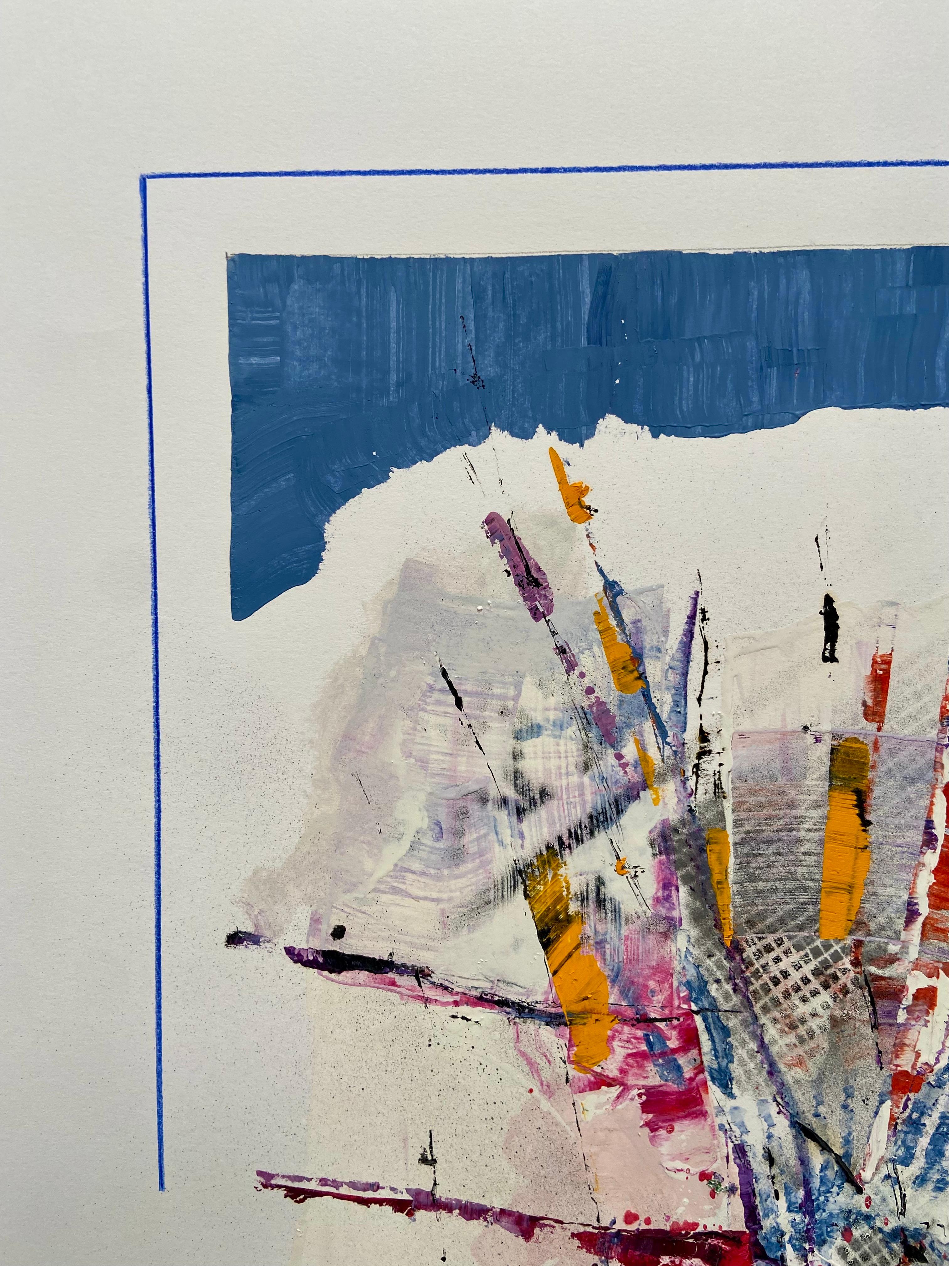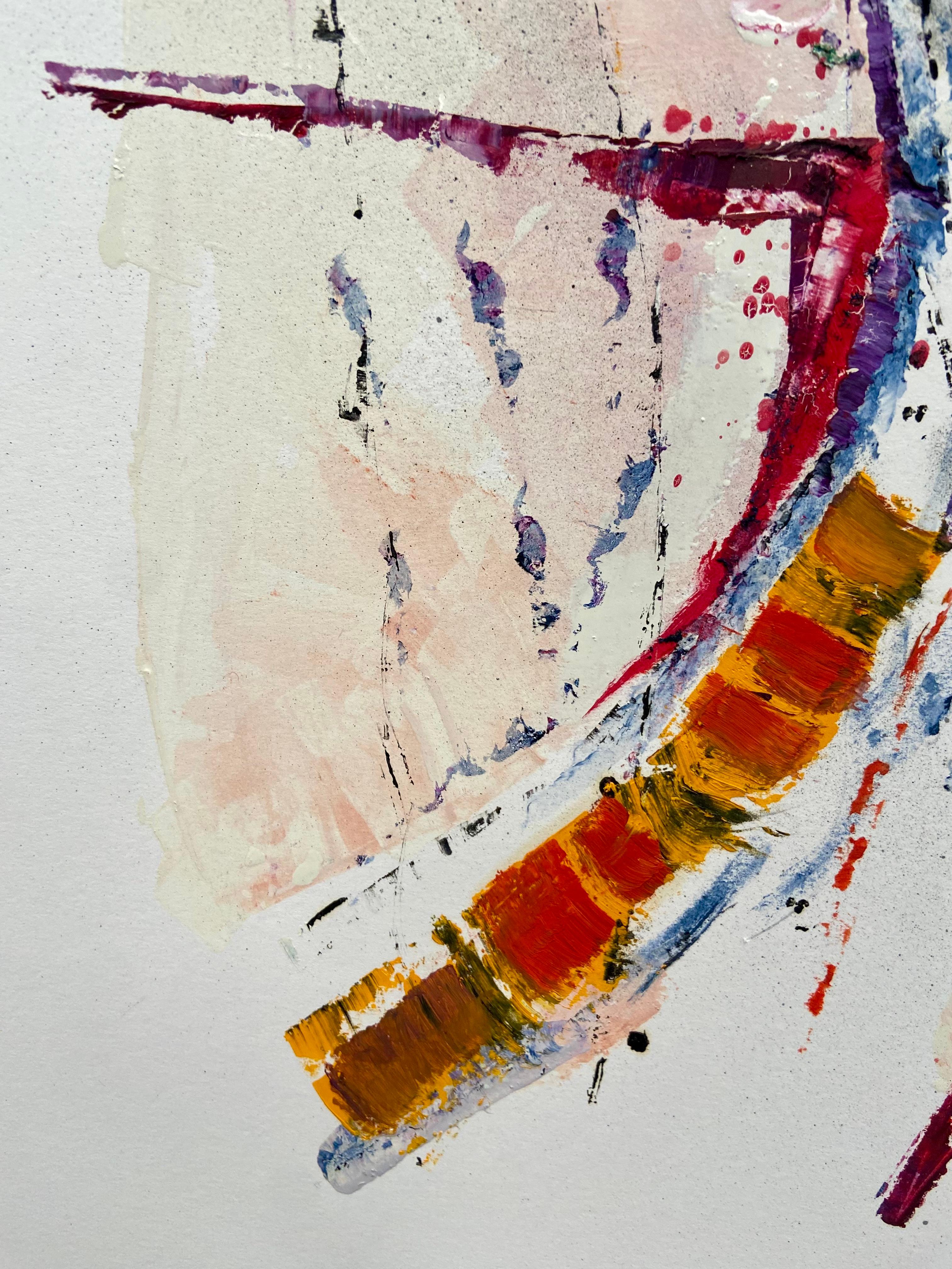 Un'accattivante esplosione di energia irradia questa vibrante opera astratta dell'artista italiano Corrado Ferrante (nato nel 1944, Italia). Eseguita a olio e tecnica mista su carta, questa composizione dinamica presenta una disposizione esplosiva di segni gestuali che emanano dal centro come fuochi d'artificio congelati nel tempo.