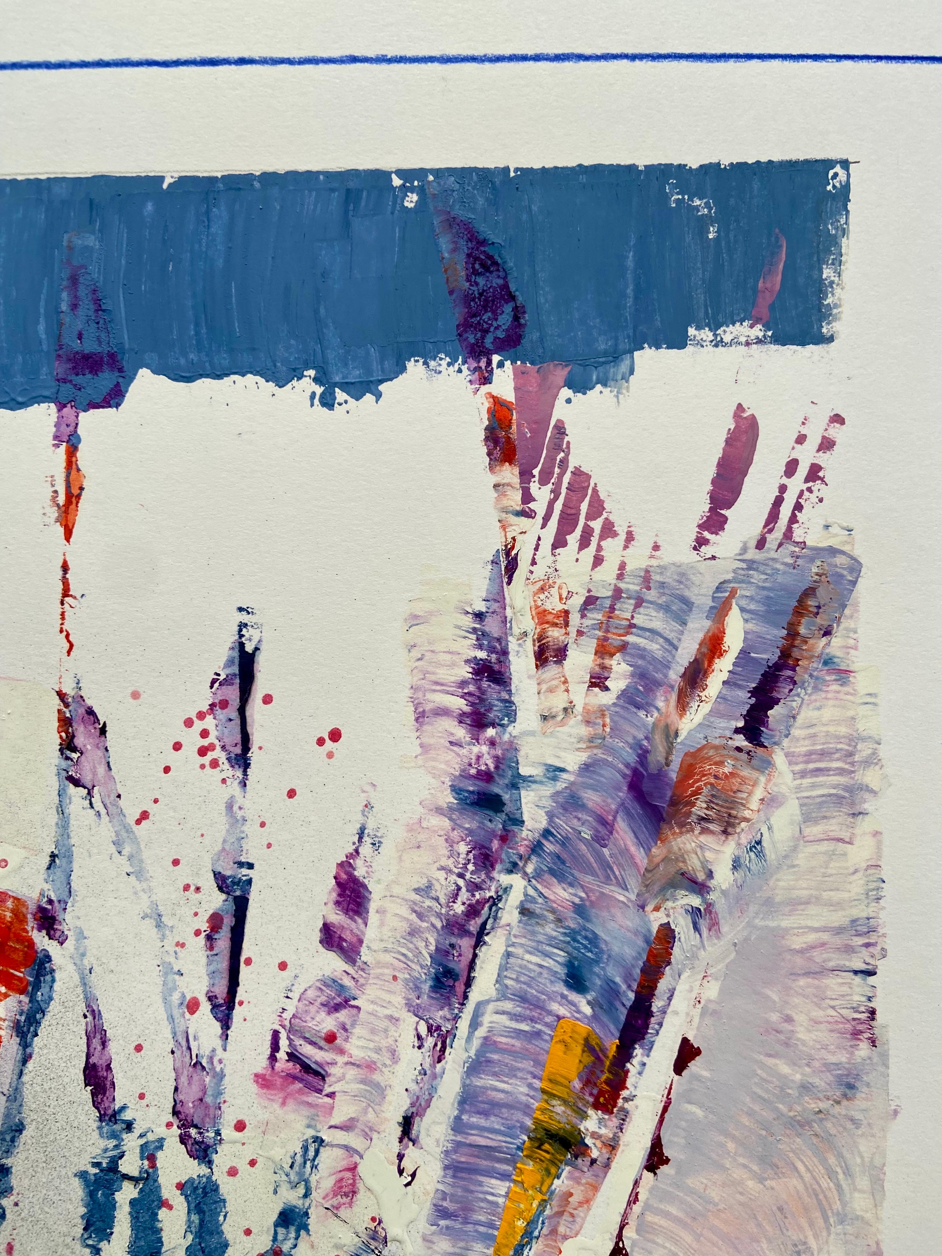 La libertà di espressione che contraddistingue Ferrante si manifesta attraverso pennellate audaci in blu cobalto, rosso cremisi, giallo dorato e viola, creando un potente senso di movimento e spontaneità. La fascia orizzontale di colore blu intenso nella parte superiore dà fondamento alla composizione, mentre il delicato equilibrio tra struttura controllata e caos espressivo riflette la ricerca di liberazione artistica che l'artista ha portato avanti per tutta la vita.