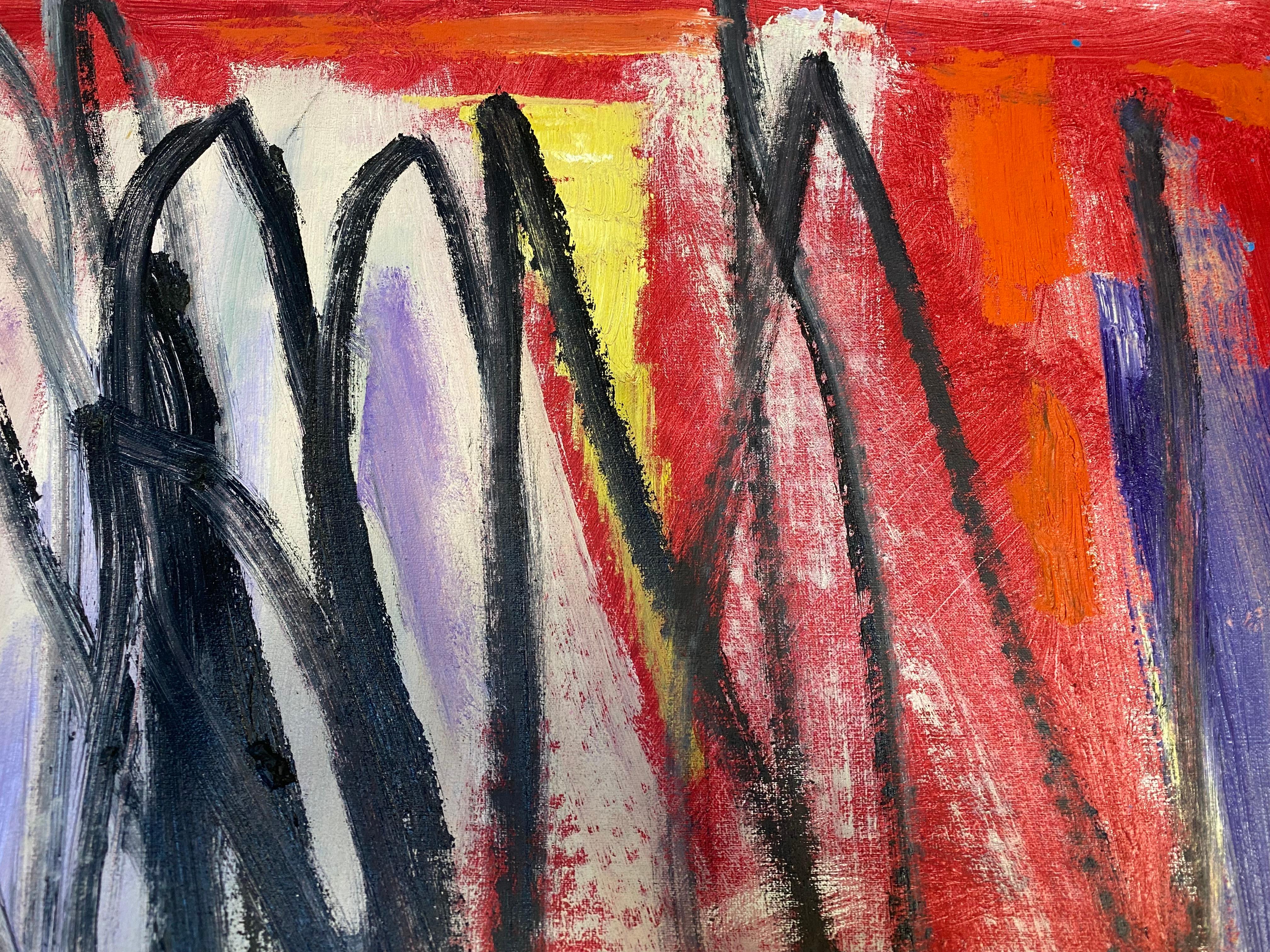 Questa composizione dinamica è stata creata nel 2022, prima della guerra, nello studio dell'artista a Kiev, in Ucraina, su una tela di lino degli anni Sessanta. L'uso di questo mater...
