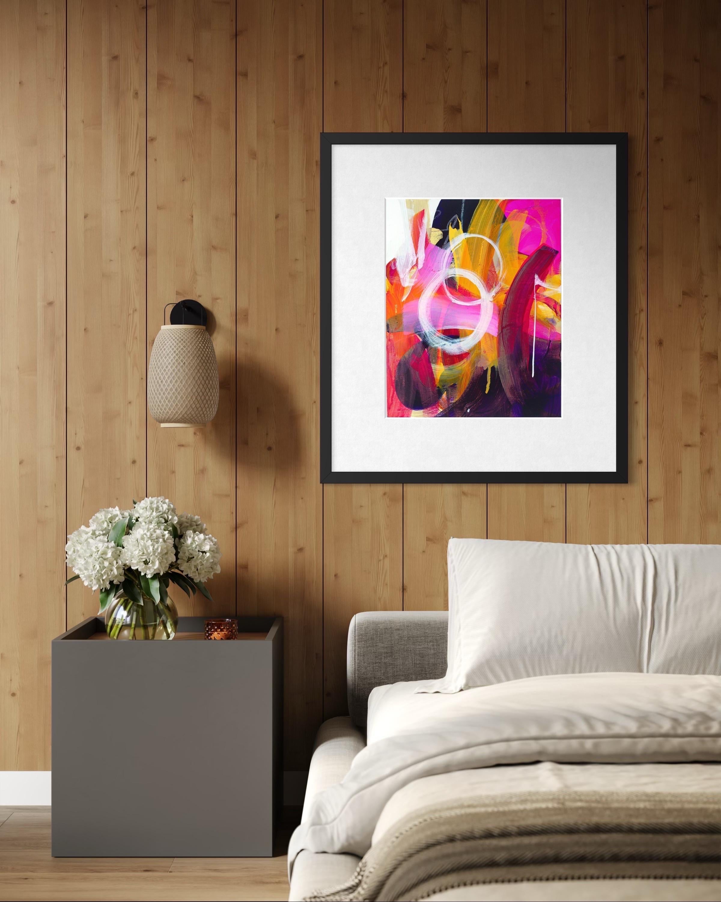"Bounce!" è un quadro astratto verticale e vivace dell'artista contemporanea Michelle Thomas.