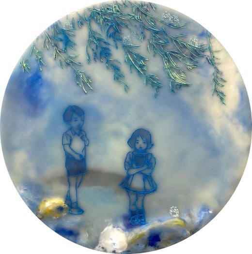 Cecile ChongOpen Seating - Paesaggio ad encausto con figure di madre e figlio, blu e giallo, 20152015