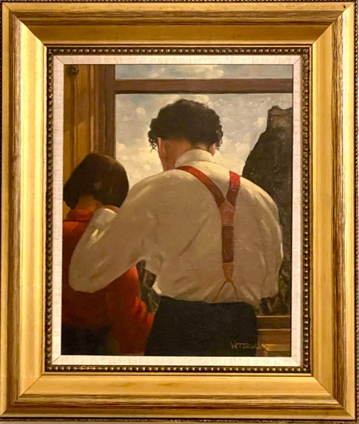 Jack Vettriano, nato Jack Hoggan il 17 novembre 1951 a Fife, in Scozia, è un rinomato pittore scozzese contemporaneo. Cresciuto in una famiglia di operai, lasciò la scuola a 16 anni per diventare un apprendista ingegnere minerario. Il suo viaggio nell'arte è iniziato all'età di 21 anni, quando la sua ragazza gli regalò un set di colori ad acquerello. Vettriano ha imparato a dipingere studiando i libri e replicando le loro tecniche. Inizialmente firmava le sue opere come "An He", ma alla fine degli anni '80 ha adottato il nome da nubile della madre, Jack Vettriano. La sua carriera ha avuto una svolta significativa nel 1989 quando ha presentato due opere alla mostra annuale della Royal Scottish Academy, entrambe vendute il primo giorno. Questo successo portò ad altre mostre e al conseguente aumento della sua popolarità. Lo stile di Vettriano si caratterizza spesso per la sua qualità narrativa e cinematografica, raffigurando spesso scene di romanticismo, mistero e fascino noir. La sua opera più famosa, "The Singing Butler" (1992), ritrae una coppia che balla su una spiaggia in tempesta ed è diventata una delle stampe d'arte più vendute nel Regno Unito. Nonostante il successo commerciale, Vettriano ha dovuto affrontare le critiche di alcuni critici d'arte che considerano il suo lavoro populista.