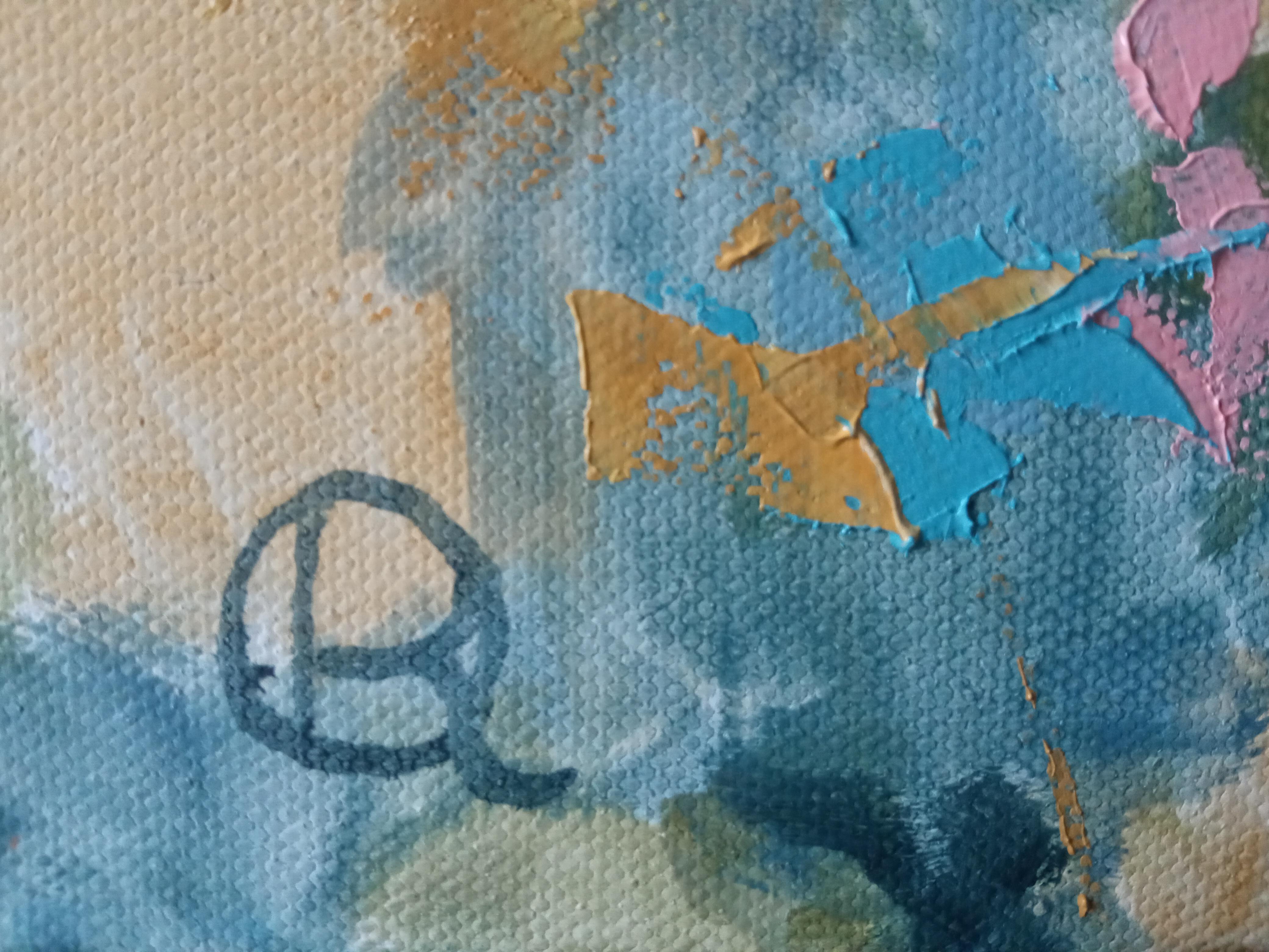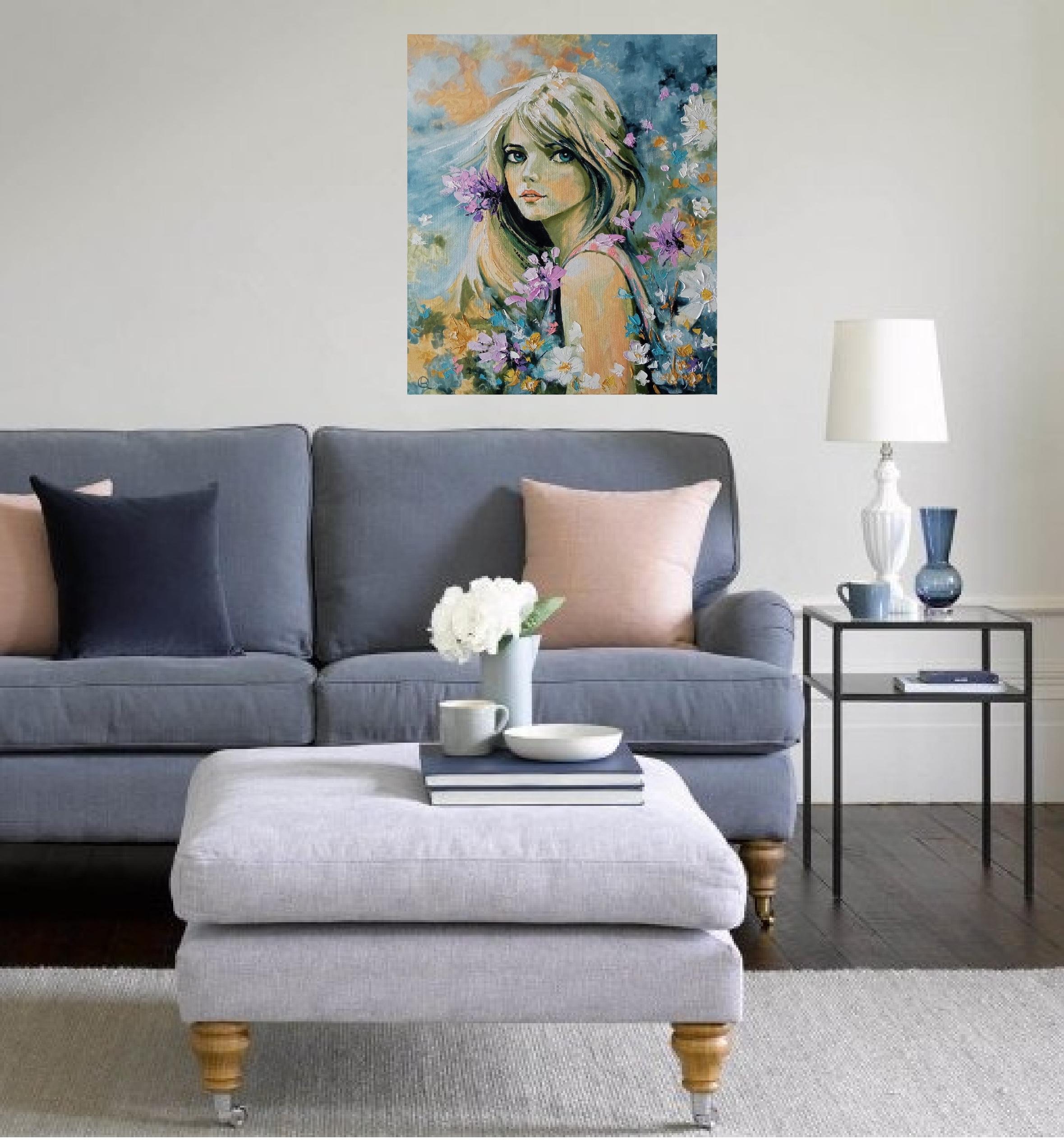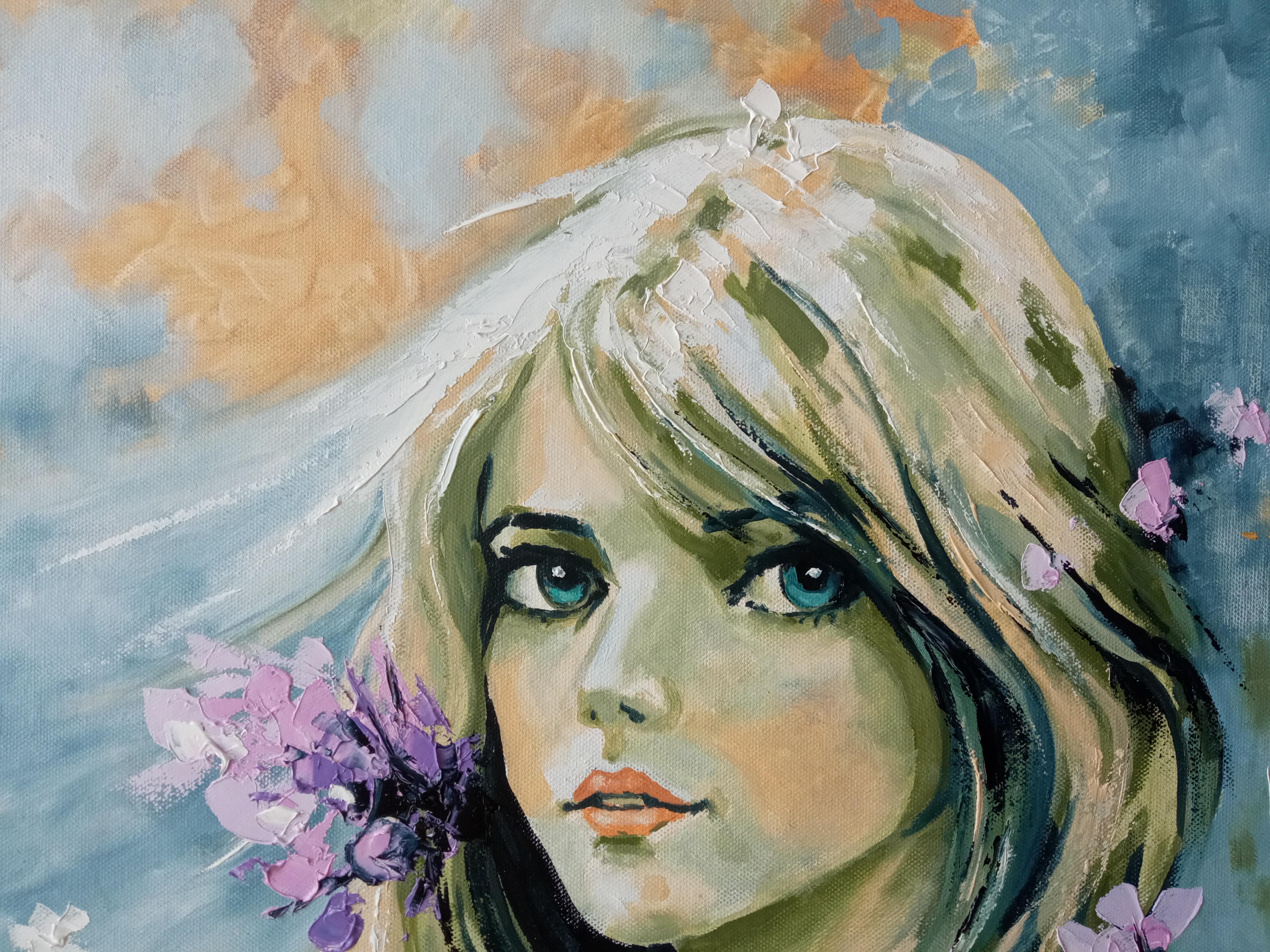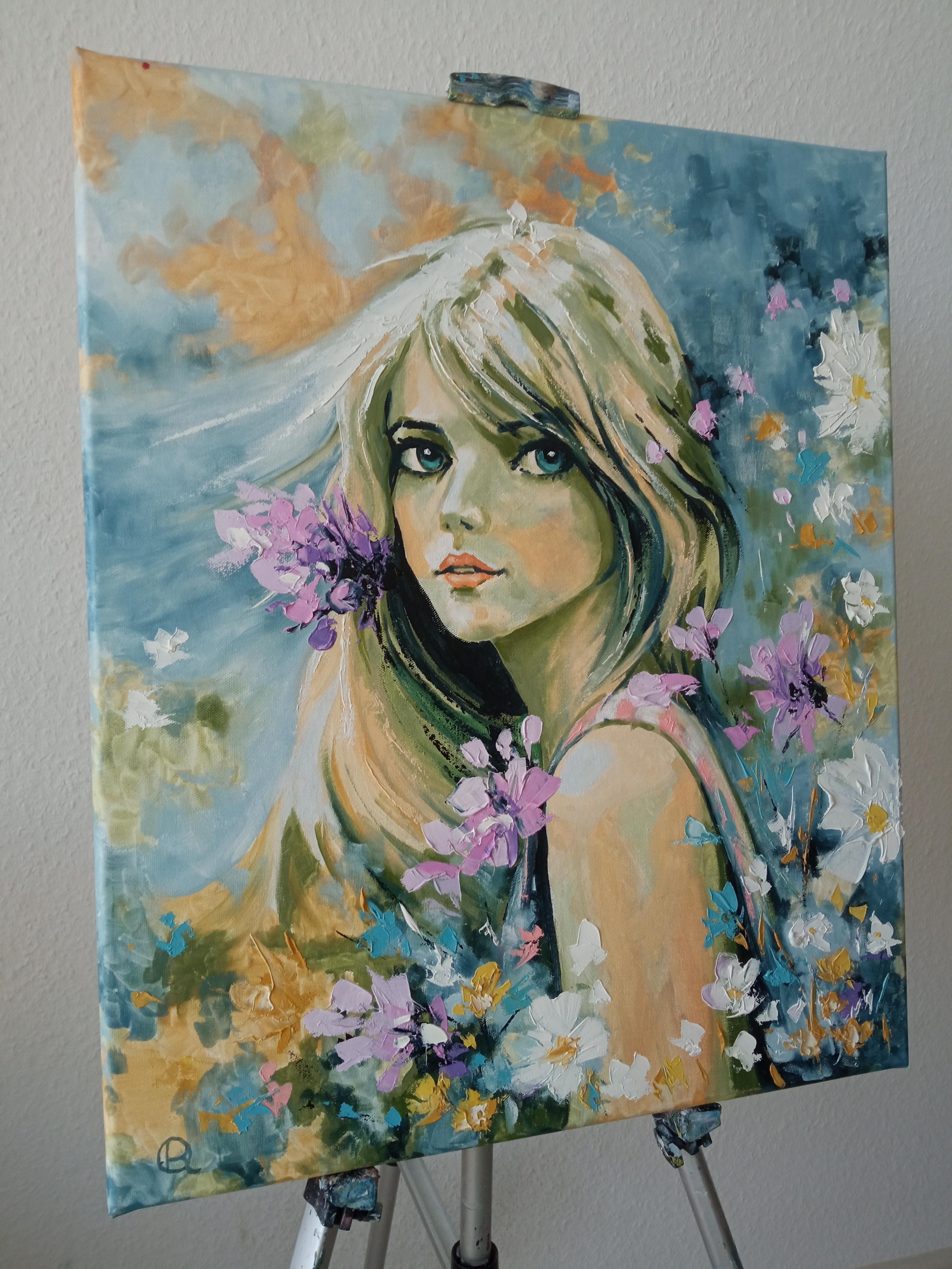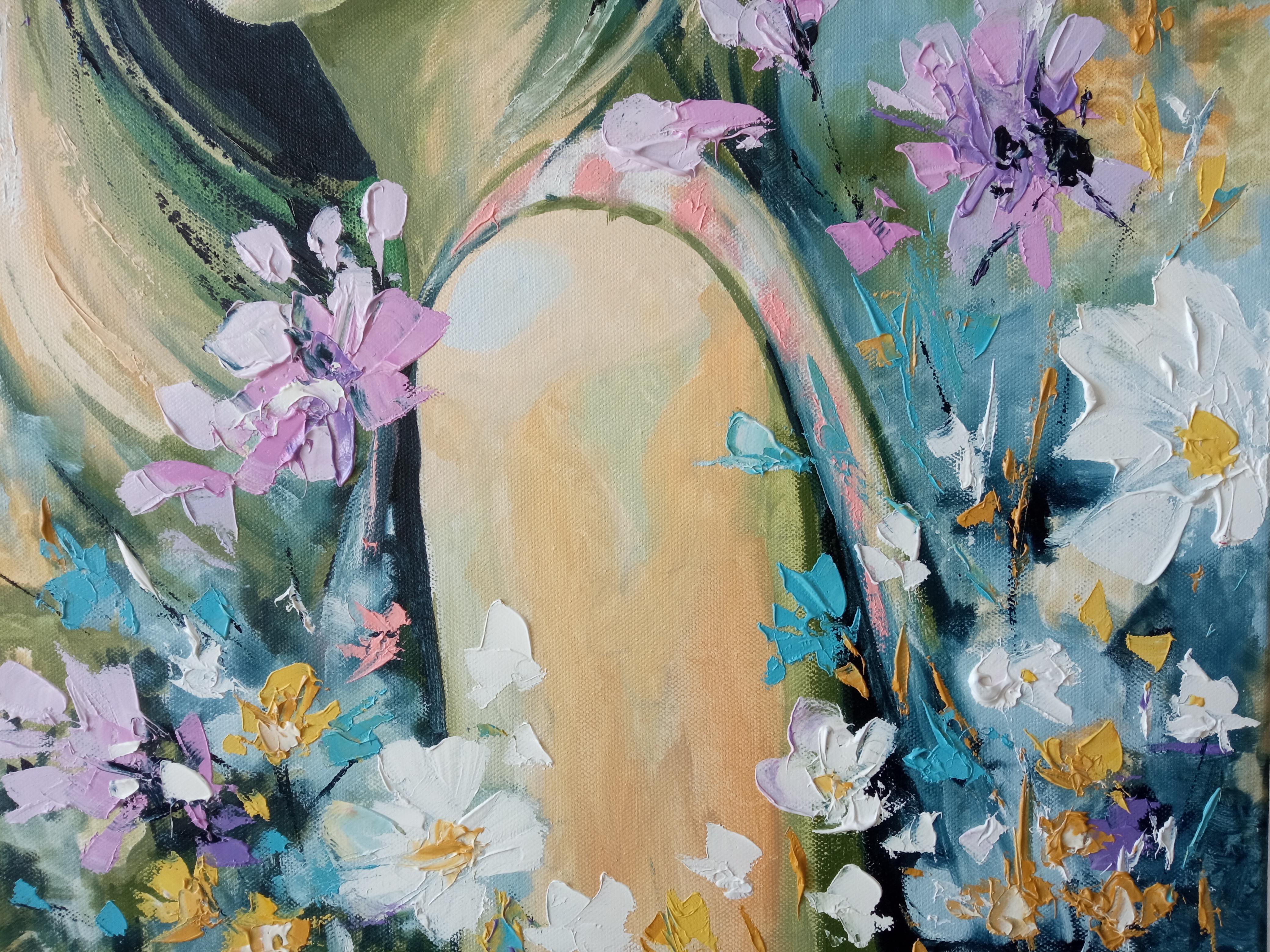 I fiori non sono semplicemente decorativi, ma ampliano il suo mondo interiore: i toni del lilla, del bianco e del turchese simboleggiano la purezza, il sogno e una sottile connessione con la natura. Ogni pennellata ha un peso emotivo, mentre la consistenza e la vivacità dei colori creano un senso di respiro vivo all'interno della tela.