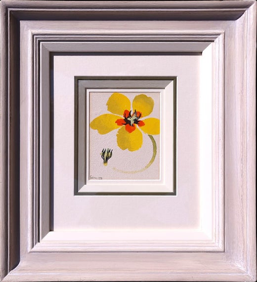 Quadro floreale di metà secolo eseguito con acrilico su tela in uno stile audace e vibrante, intitolato Buttercup. Firmato McFeatters e presentato nella cornice originale in alluminio.