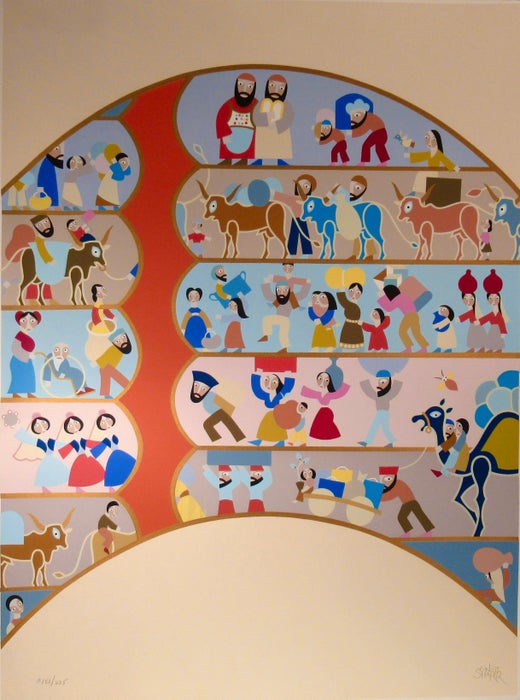David Sharir: David Sharir è un importante artista israeliano contemporaneo che ha studiato arte a Tel Aviv. In seguito divenne uno studente dell'Accademia del Bella Arte di Firenze e studiò architettura e design teatrale all'Università di Roma. Una volta tornato in Israel, David Sharir divenne famoso per i suoi numerosi e fantastici am designs per il teatro. Le sue prime mostre d'arte personali hanno avuto luogo a Tel Aviv (1959) e a Roma (1961). Da allora la sua arte è stata spesso esposta in Israel, Italia, Germania, Francia e Stati Uniti. Le stampe e i dipinti originali di David Sharir fanno parte di importanti collezioni come il Tel Aviv Museum, Israele, l'Israel Museum, Gerusalemme, il Philadelphia Museum of Art e il Los Angeles County Museum. L'arte di David Sharir si basa su molti elementi. Ha trovato ispirazione da forme d'arte come la calligrafia degli scribi della Torah, i manoscritti ebraici medievali, i dipinti dei primitivi italiani e le opere dell'arte popolare russa per creare il proprio stile, bello e altamente decorativo.