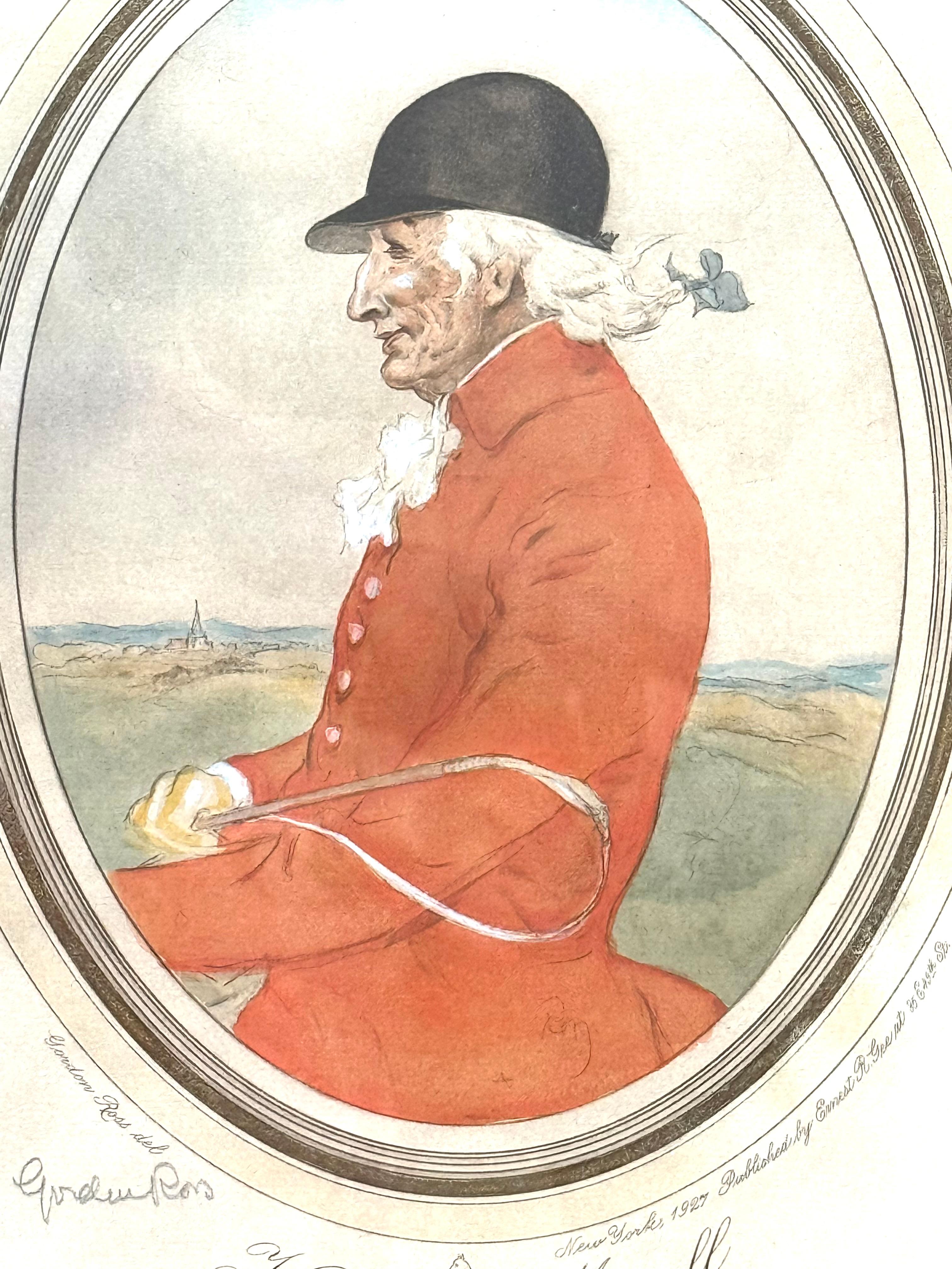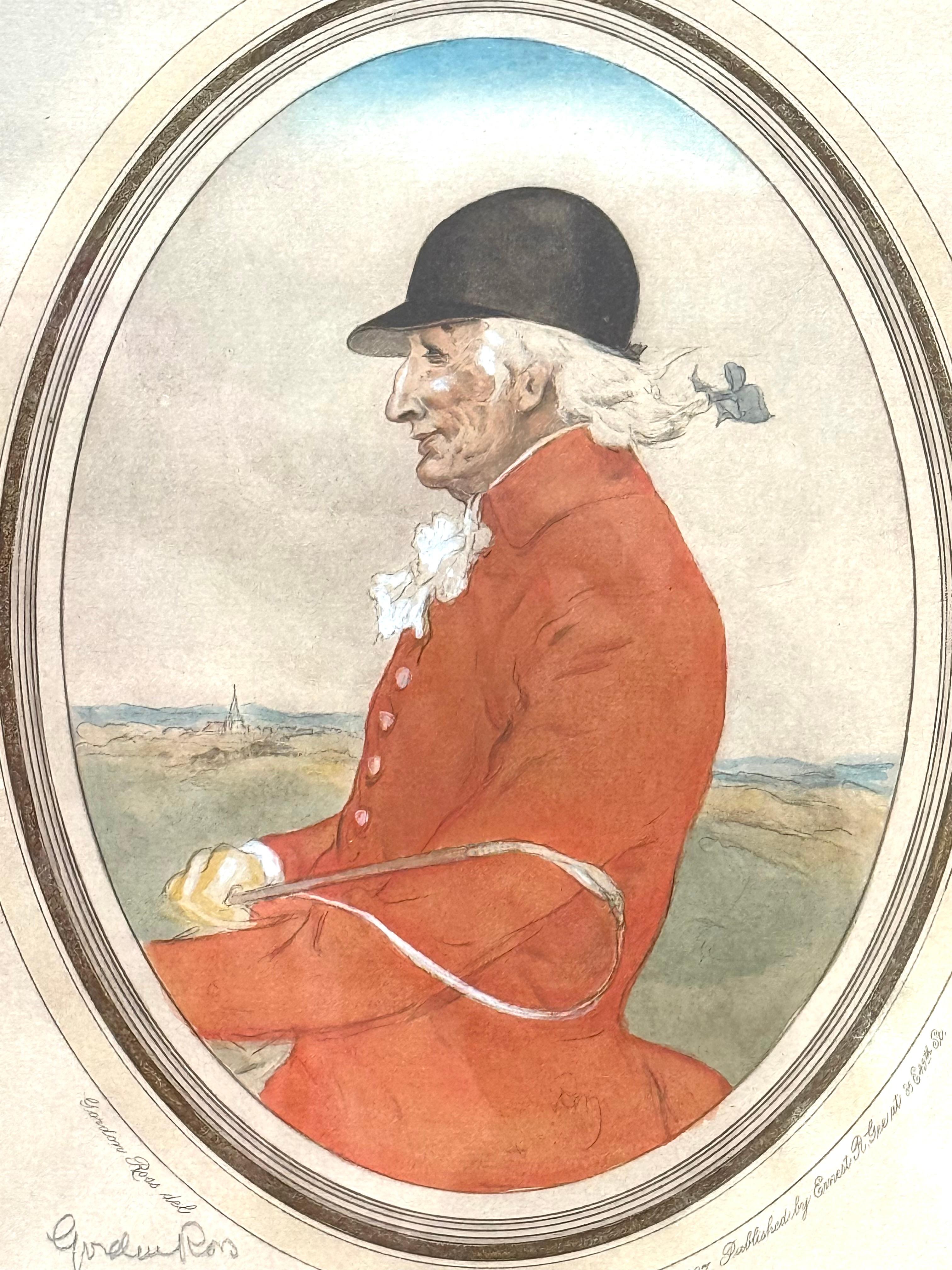 Litografia originale colorata a mano di Hugo Meynell dell'artista scozzese/americano Gordon Ross. Fatto nel 1927. Firmato a matita dall'artista in basso a sinistra. Le condizioni sono eccellenti. Splendidamente opacizzato e incorniciato. Le misure complessive della cornice sono 17,25 per 14,25 pollici. Provenienza: Un collezionista del Massachusetts.