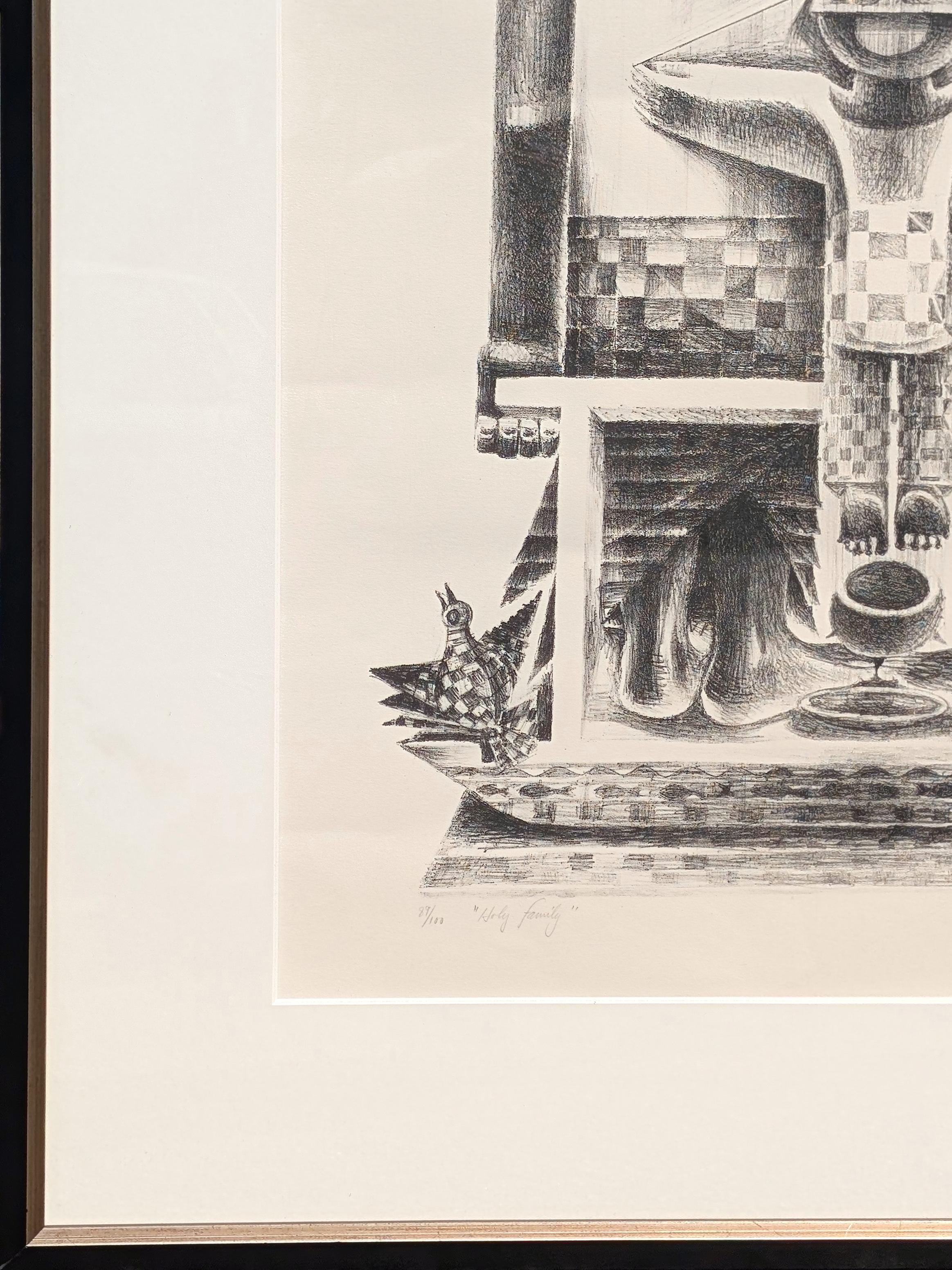 Litografia figurativa in bianco e nero del 1983 intitolata "Sacra Famiglia" dell'artista americano John Thomas Biggers.