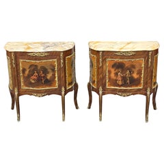 Coppia di commodes dipinte in stile Vernis Martin francese, ciascuna con piano in marmo su porte singole con scene dipinte incorniciate da montature in bronzo. Quadro firmato A Manci...