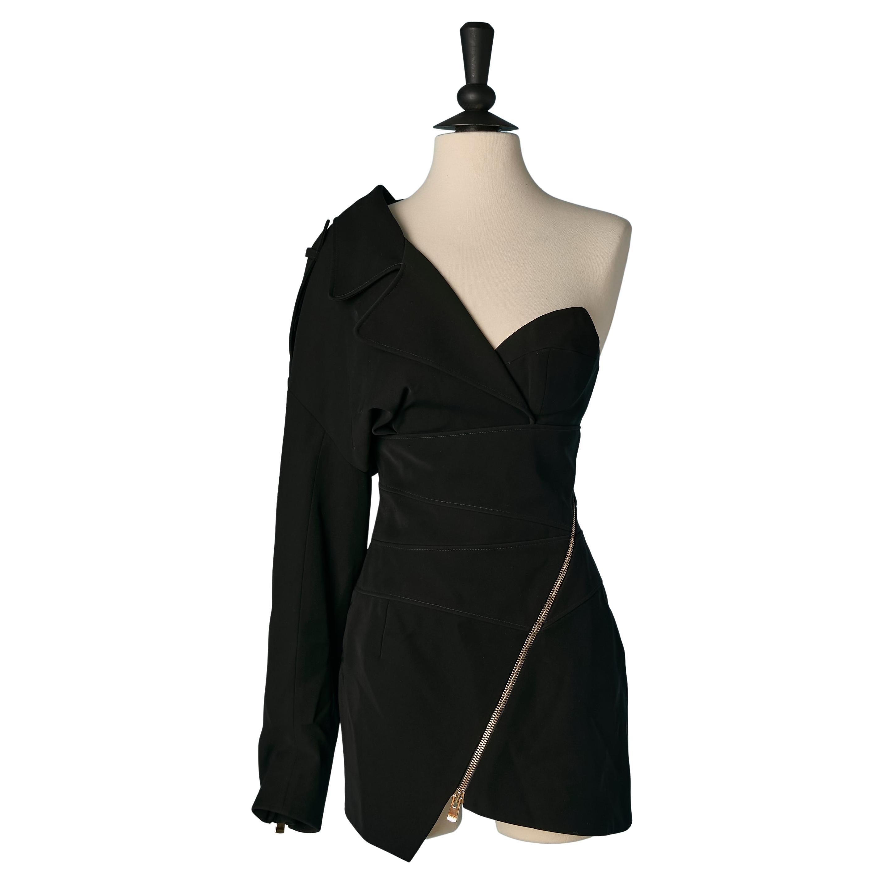 Mini abito asimmetrico in jersey nero con strass. Fodera in jersey nero. Un pad per la spalla. Raccogliere . Chiusura invisibile con zip e gancio sulla parte centrale della schiena. ...