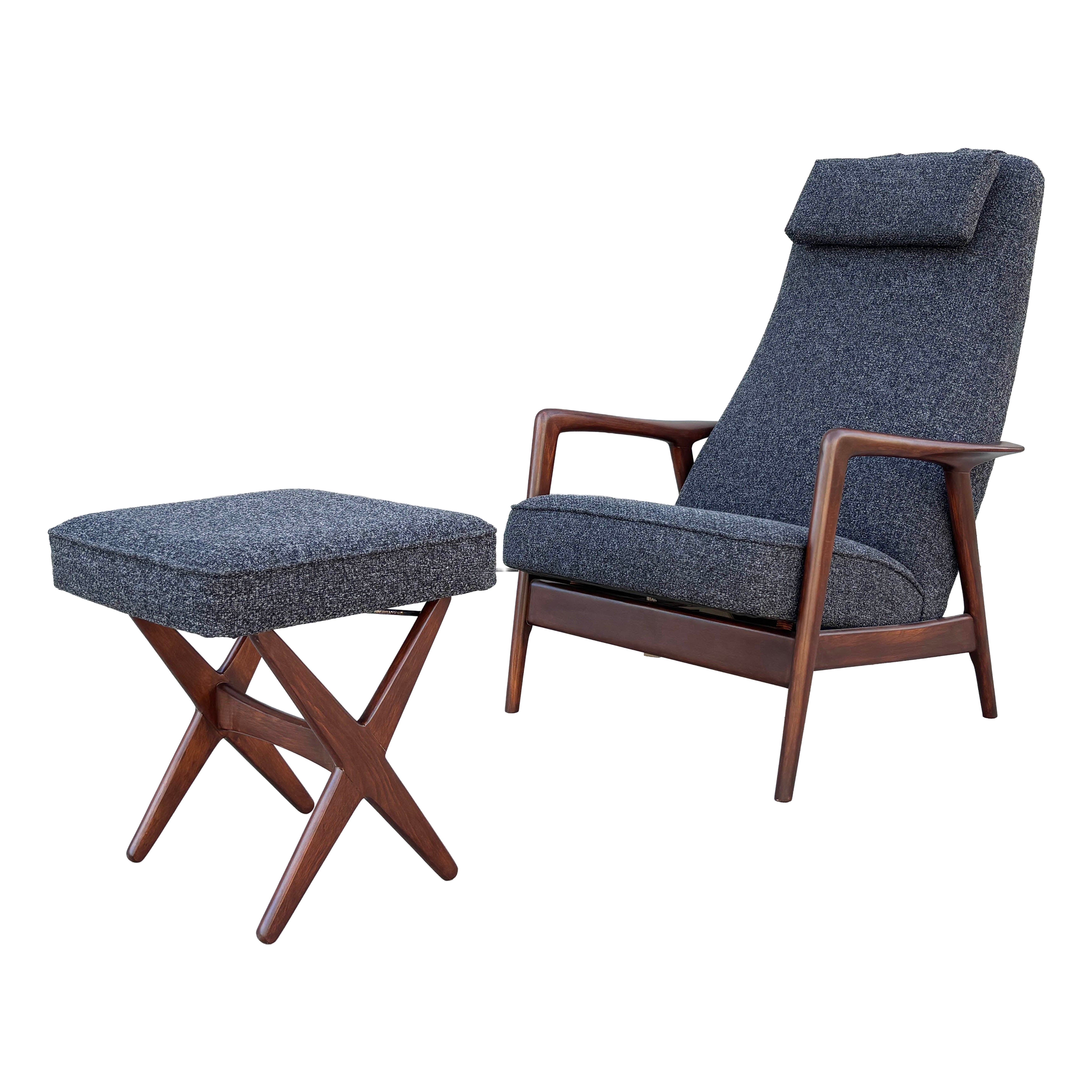 ✨ Sedia lounge reclinabile e ottomana in noce di metà secolo di Alf Svensson per DUX ✨
