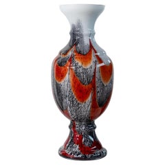 Il vaso in vetro artistico vintage ha una forma a brocca con manico scultoreo in vetro trasparente applicato e un corpo multicolore complesso; strati di vetro grigio scuro, marrone m...