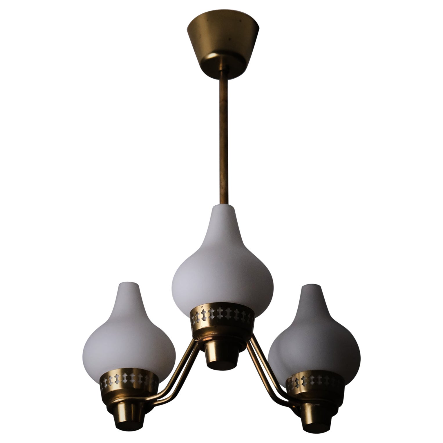 Lampadario a tre bracci in ottone e vetro opalino bianco progettato e prodotto da ASEA, Svezia, anni '50 circa.
