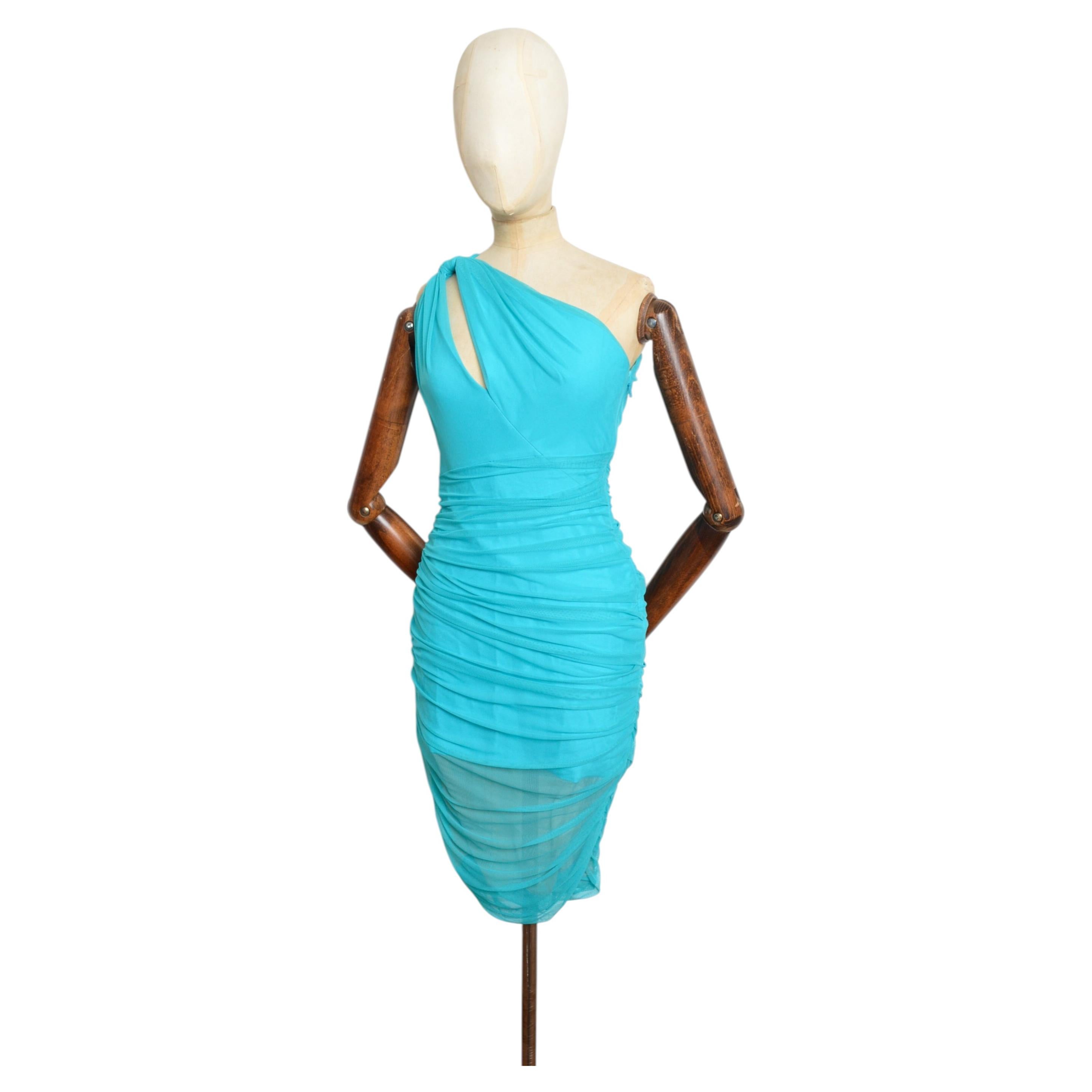 Incredibile abito primavera/estate 2005 di Donatella Versace Jeans Couture in seta con stampa denim fluttuante e slogan colorati, ricamo di farfalle e bustier aderente, top a corsett...