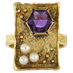 Antico anello Suffragette in oro 18ct edoardiano con ametista, peridoto e diamanti intagliati