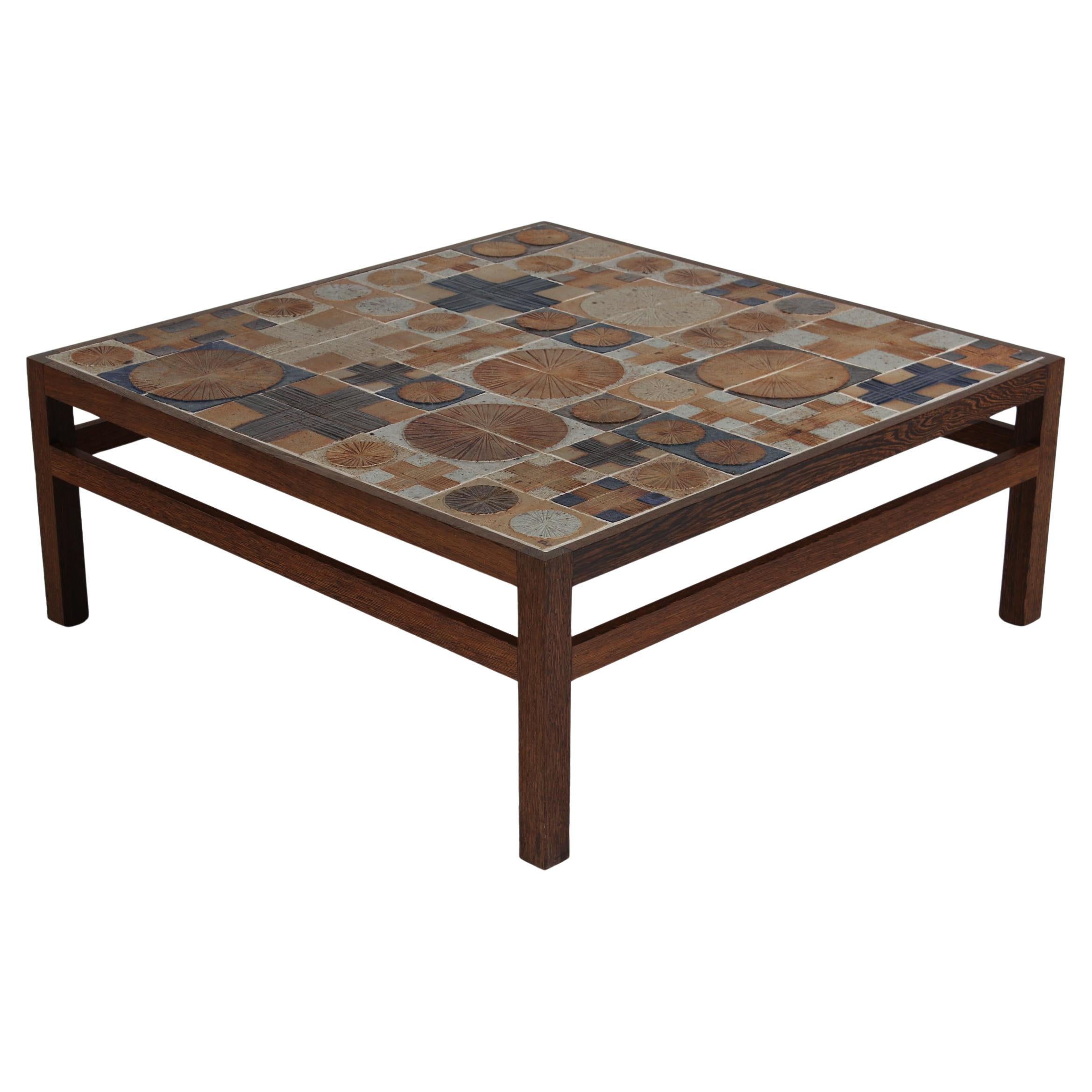 Grazioso e insolito tavolino da caffè realizzato con piastrelle in gres e struttura in legno. Realizzato negli anni '60, progettato dall'artista Tue Poulsen e dal designer Erik Wort...