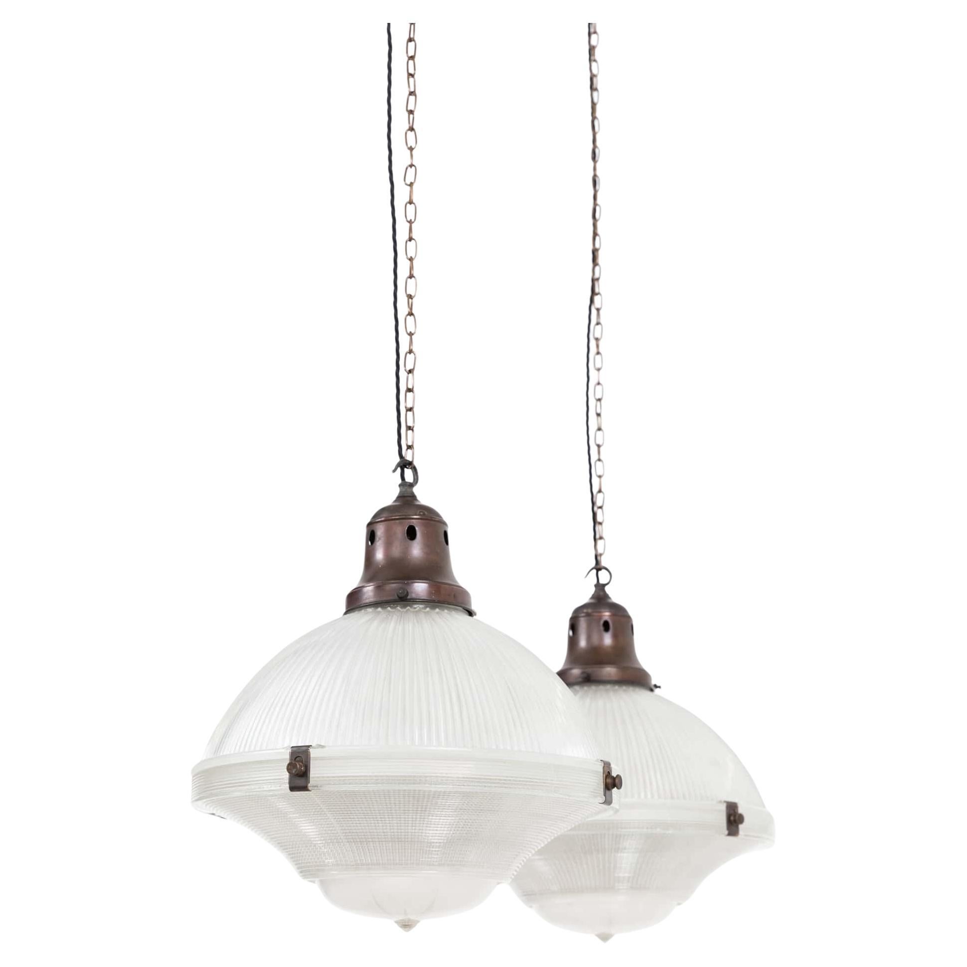 Coppia di lampade a sospensione in vetro a spillo Holophane, in rame, del 1910 ca.