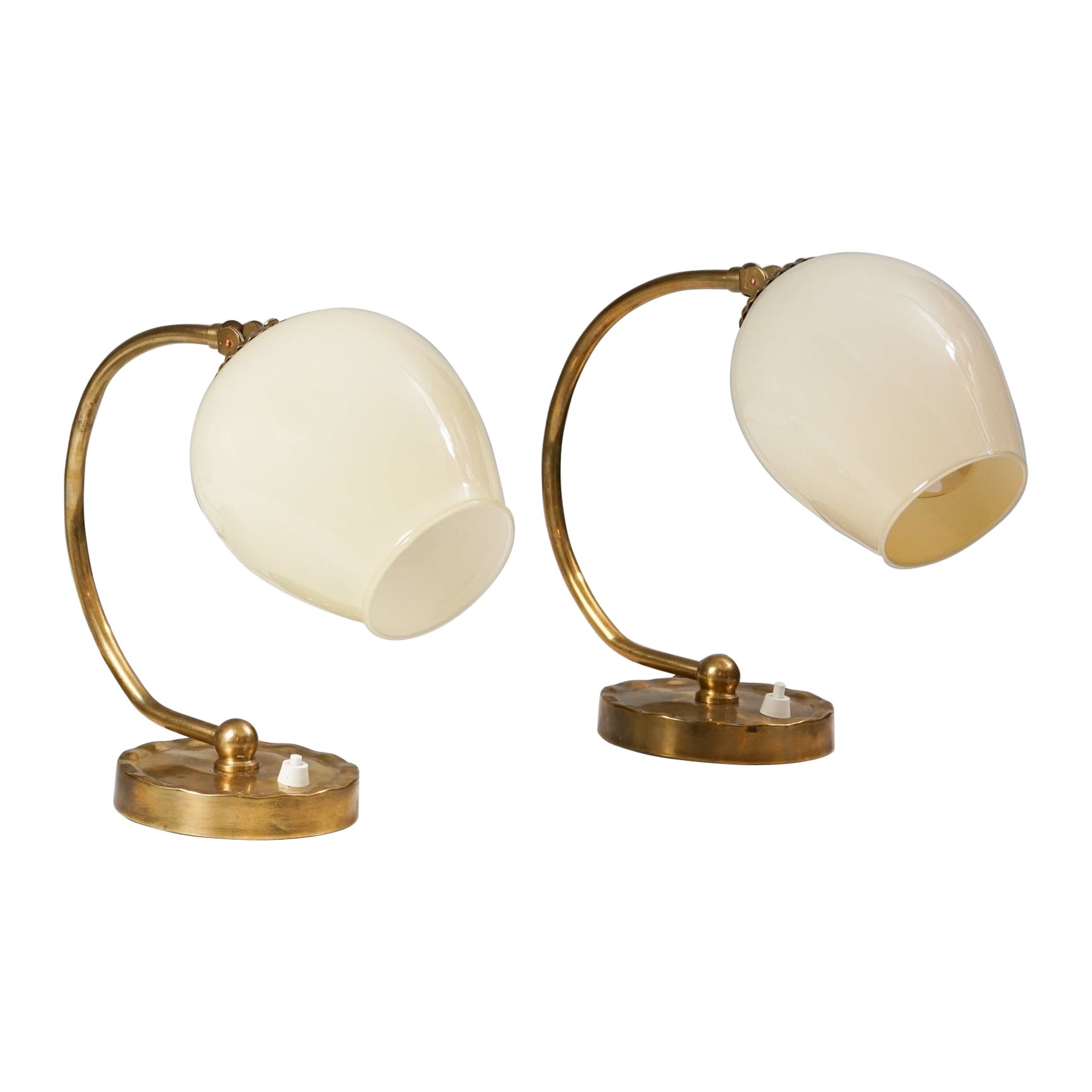 Una coppia di lampade da incasso disegnate da Paavo Tynell per Taito-idman, modello 1621. Circa 1940. Vetro bianco su ferramenta in ottone nichelato. Due prese di tipo Edison. Cablag...