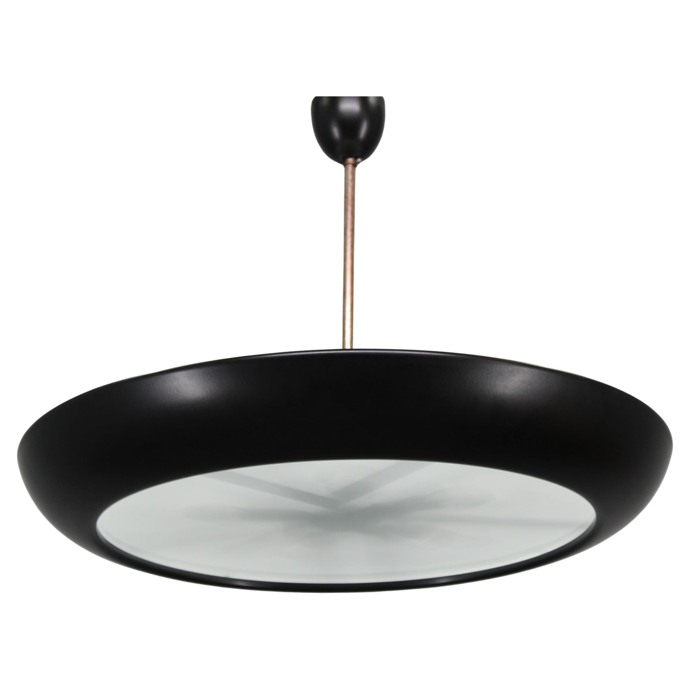 Questa rara lampada a sospensione UFO dell'epoca Bauhaus, progettata da Josef Hůrka per NAPAKO nella Cecoslovacchia degli anni '40, esemplifica la purezza e la funzionalità dell'ill...