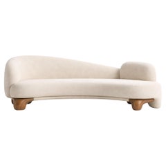 La chaise longue di grandi dimensioni Belmont è caratterizzata da linee morbide e curve e da una seduta in tessuto leggero e luminoso dalla consistenza felpata. La sua base in impial...