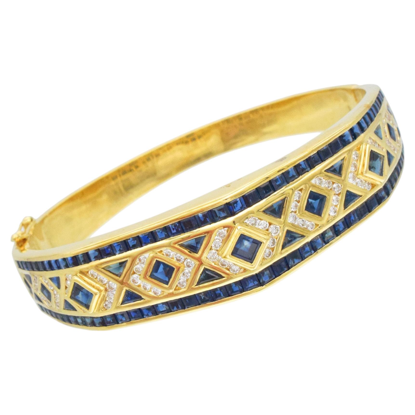Bracciale Levian con zaffiri e diamanti in oro giallo 18 carati. Questo braccialetto bangle con chiusura a cerniera è caratterizzato da graduazioni design. La parte anteriore è decor...