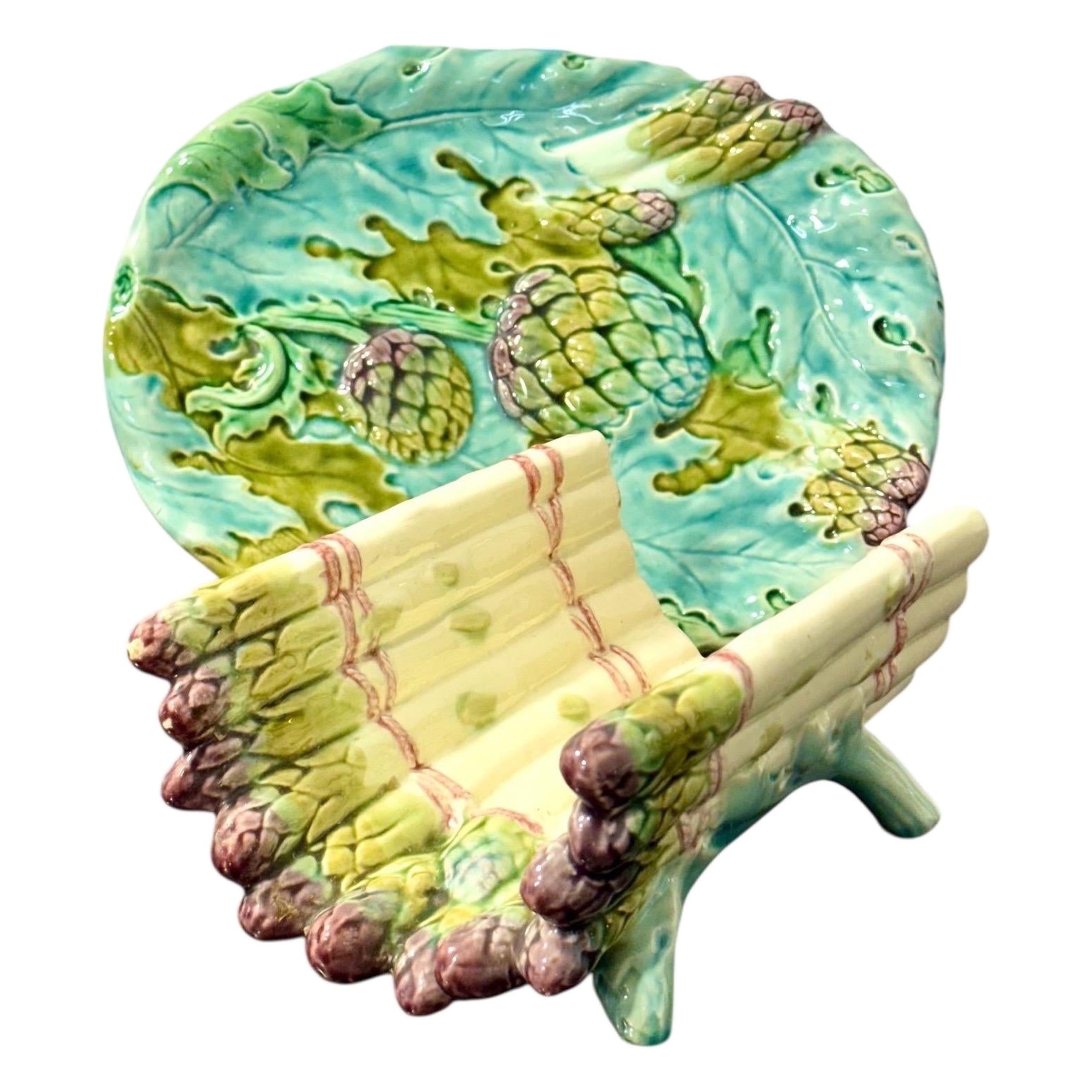 Piatto di asparagi in maiolica in due pezzi firmato Longchamp, circa 1890.